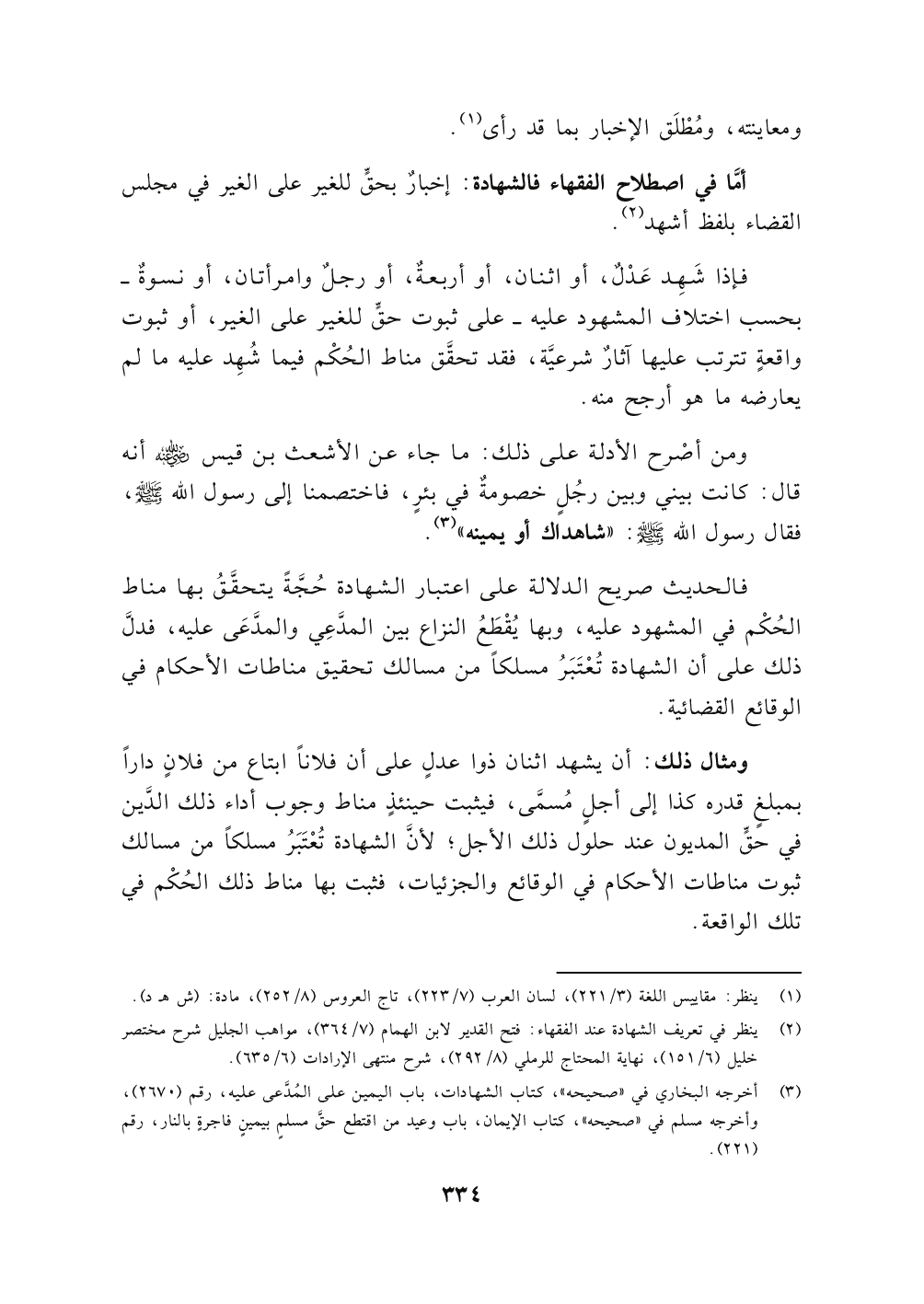 (٢) ينظر في تعريف الشهادة عند الفقهاء: فتح القدير لابن الهمام (٧/ ٣٦٤)، مواهب الجليل شرح مختصر خليل (٦/ ١٥١)، نهاية المحتاج للرملي (٨/ ٢٩٢)، شرح منتهى الإرادات (٦/ ٦٣٥).