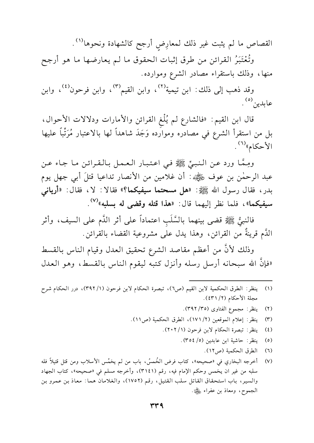 ومِمَّا ورد عن النبيِّ صلى الله عليه وسلم في اعتبار العمل بالقرائن ما جاء عن عبدالرحمن بن عوف رضي الله عنه أن غلامين من الأنصار تداعيا قتلَ ... أبي جهل (٧)