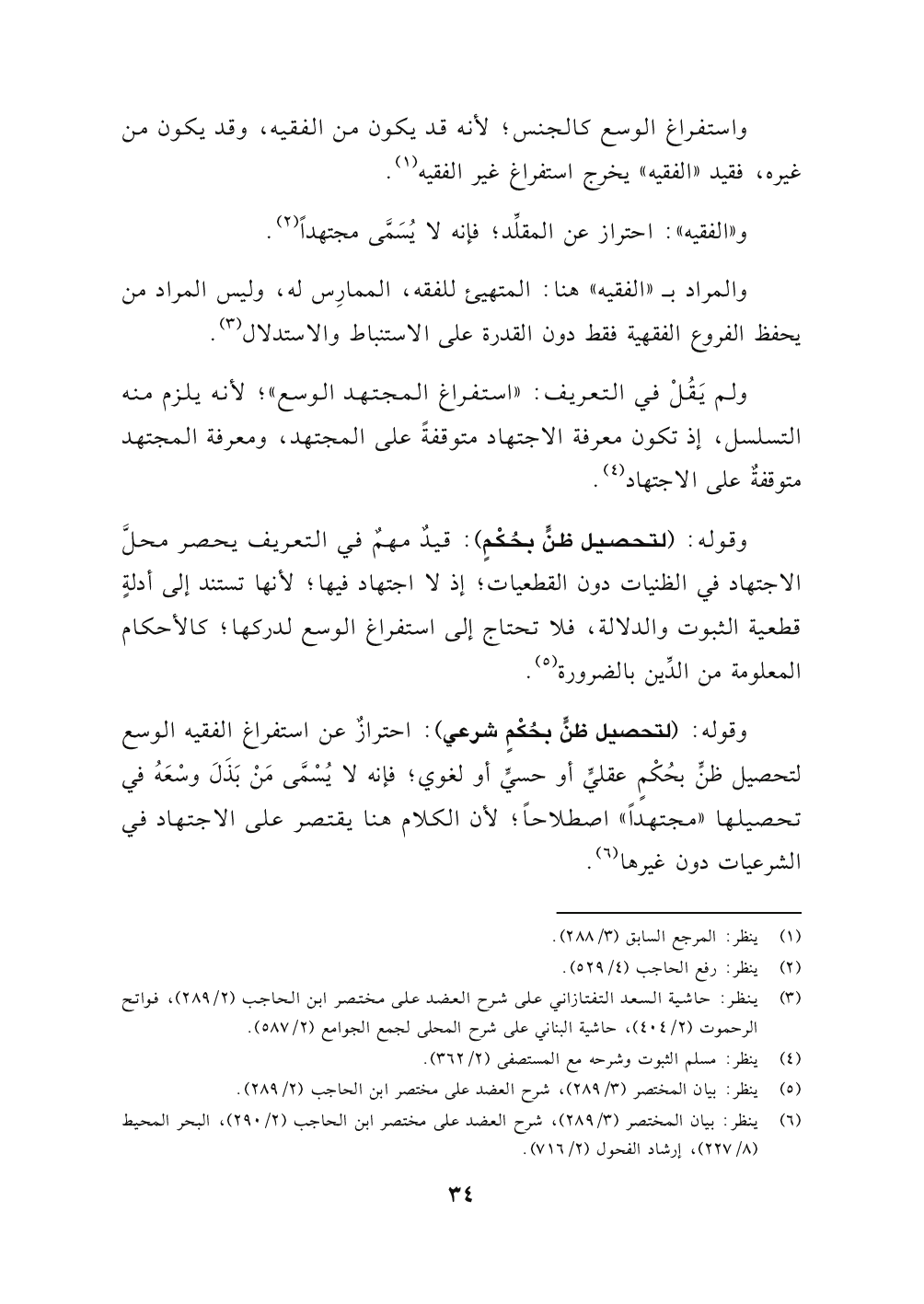 ولم يَقُلْ في التعريف: " استفراغ المجتهد الوسع "؛ لأنه يلزم منه التسلسل، إذ تكون معرفة الاجتهاد متوقفةً على المجتهد، ومعرفة المجتهد متوقفةٌ على الاجتهاد (٤).