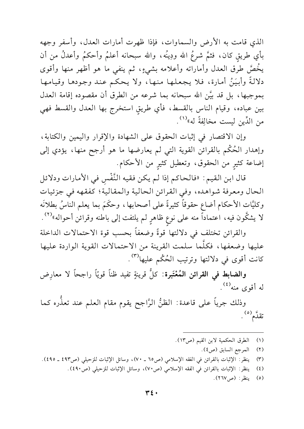 وإن الاقتصار في إثبات الحقوق على الشهادة والإقرار واليمين والكتابة، وإهدار الحُكْم بالقرائن القوية التي لم يعارضها ما هو أرجح منها، يؤدي إلى إضاعة كثيرٍ من الحقوق، وتعطيل كثيرٍ من الأحكام.