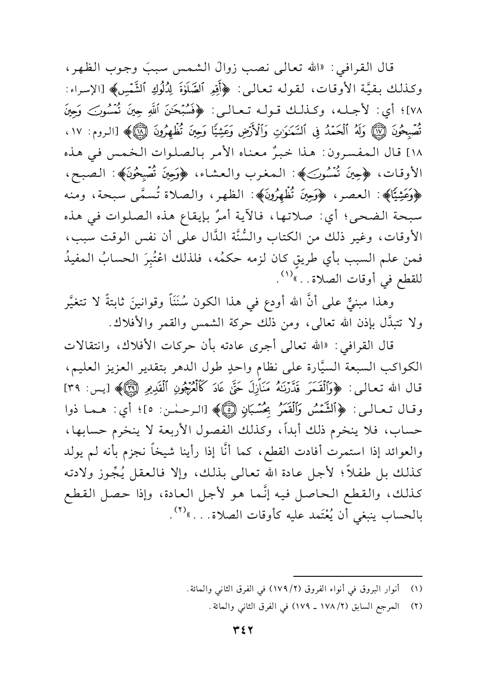 قال القرافي: " الله تعالى أجرى عادته بأن حركات الأفلاك، وانتقالات الكواكب السبعة السيَّارة على نظامٍ واحدٍ طول الدهر بتقدير العزيز العليم، قال الله تعالى: {وَالْقَمَرَ قَدَّرْنَاهُ مَنَازِلَ حَتَّى عَادَ كَالْعُرْجُونِ الْقَدِيمِ (٣٩)} [يس: ٣٩] وقال تعالى: {الشَّمْسُ وَالْقَمَرُ بِحُسْبَانٍ (٥)} [الرحمن: ٥] أي: هما ذوا حساب، فلا ينخرم ذلك أبداً، وكذلك الفصول الأربعة لا ينخرم حسابها، والعوائد إذا استمرت أفادت القطع، كما أنَّا إذا رأينا شيخاً نجزم بأنه لم يولد كذلك بل طفلاً؛ لأجل عادة الله تعالى بذلك، وإلا فالعقل يُجِّوز ولادته كذلك، والقطع الحاصل فيه إنَّما هو لأجل العادة، وإذا حصل القطع بالحساب ينبغي أن يُعْتَمد عليه كأوقات الصلاة ... " (٢).