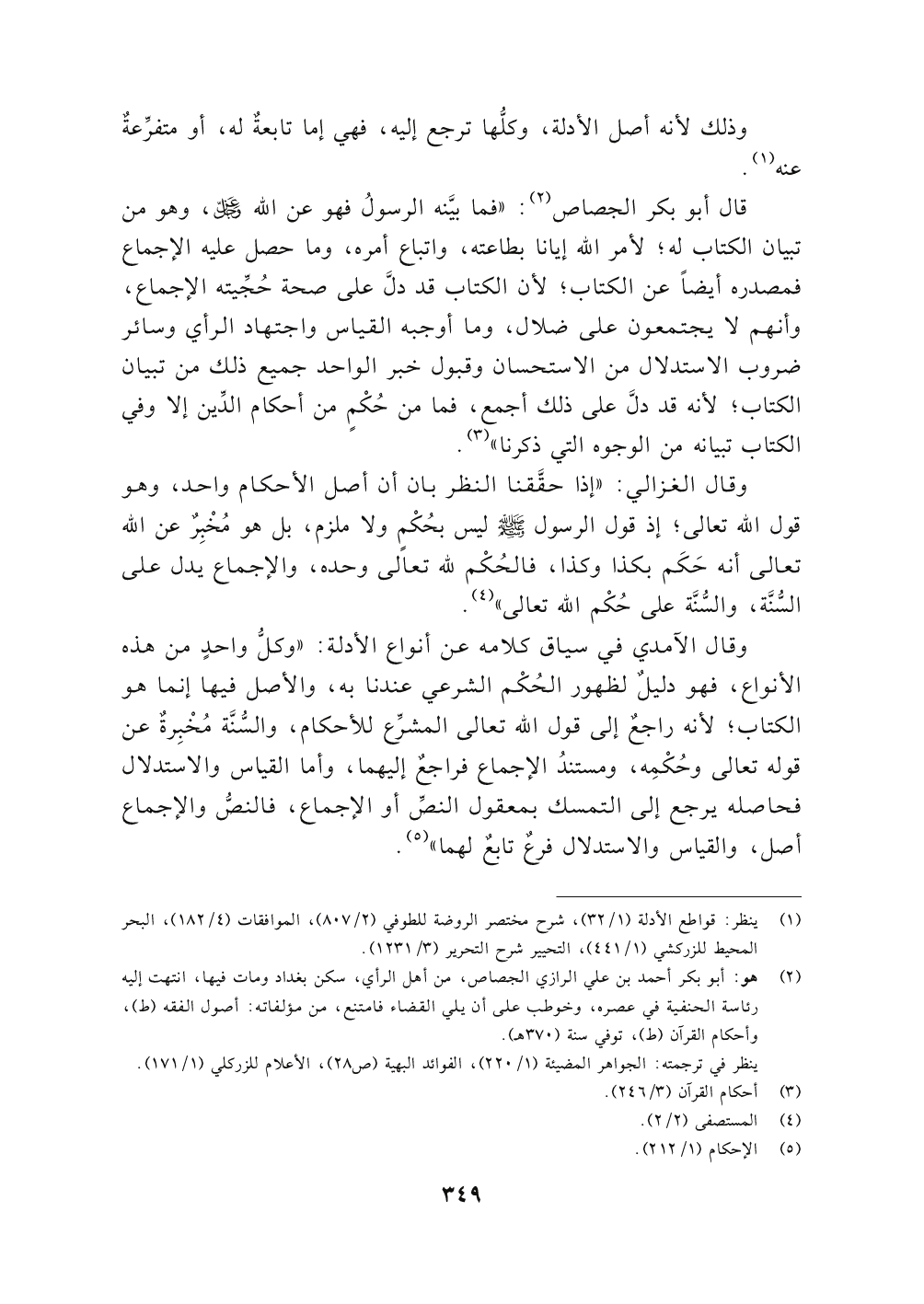 قال أبوبكر الجصاص (٢): " فما بيِّنه الرسولُ فهو عن الله عز وجل , وهو من تبيان الكتاب له؛ لأمر الله إيانا بطاعته , واتباع أمره , وما حصل عليه الإجماع فمصدره أيضاً عن الكتاب؛ لأن الكتاب قد دلَّ على صحة حُجِّيته الإجماع, وأنهم لا يجتمعون على ضلال , وما أوجبه القياس واجتهاد الرأي وسائر ضروب الاستدلال من الاستحسان وقبول خبر الواحد جميع ذلك من تبيان الكتاب؛ لأنه قد دلَّ على ذلك أجمع , فما من حُكْمٍ من أحكام الدِّين إلا وفي الكتاب تبيانه من الوجوه التي ذكرنا" (٣).