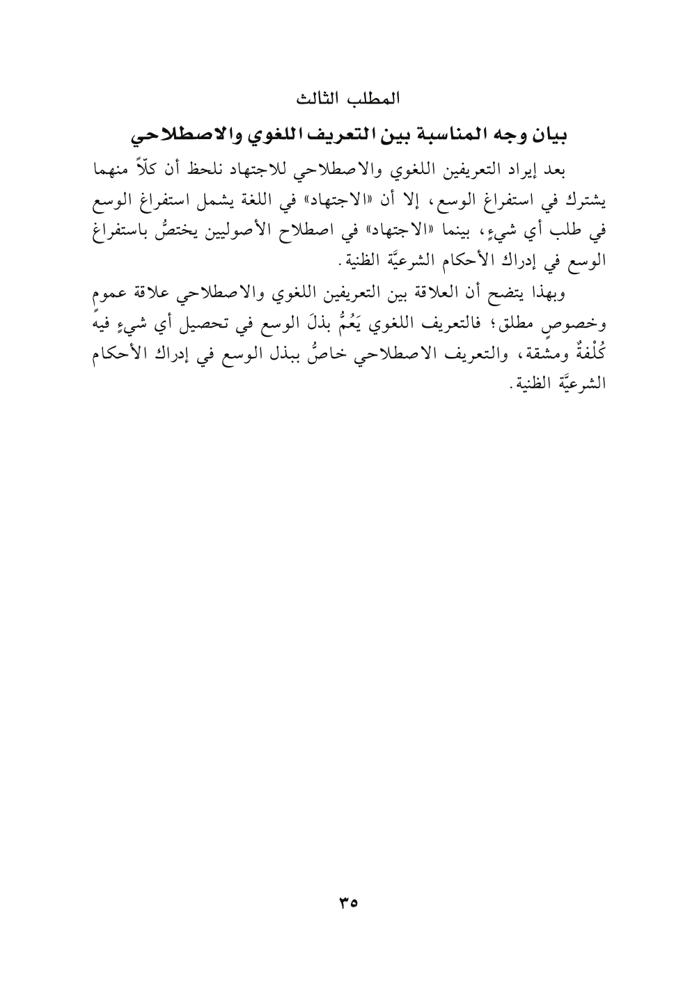 وبهذا يتضح أن العلاقة بين التعريفين اللغوي والاصطلاحي علاقة عمومٍ وخصوصٍ مطلق؛ فالتعريف اللغوي يَعُمُّ بذلَ الوسع في تحصيل أي شيءٍ فيه كُلْفةٌ ومشقة، والتعريف الاصطلاحي خاصُّ ببذل الوسع في إدراك الأحكام الشرعيَّة الظنية.