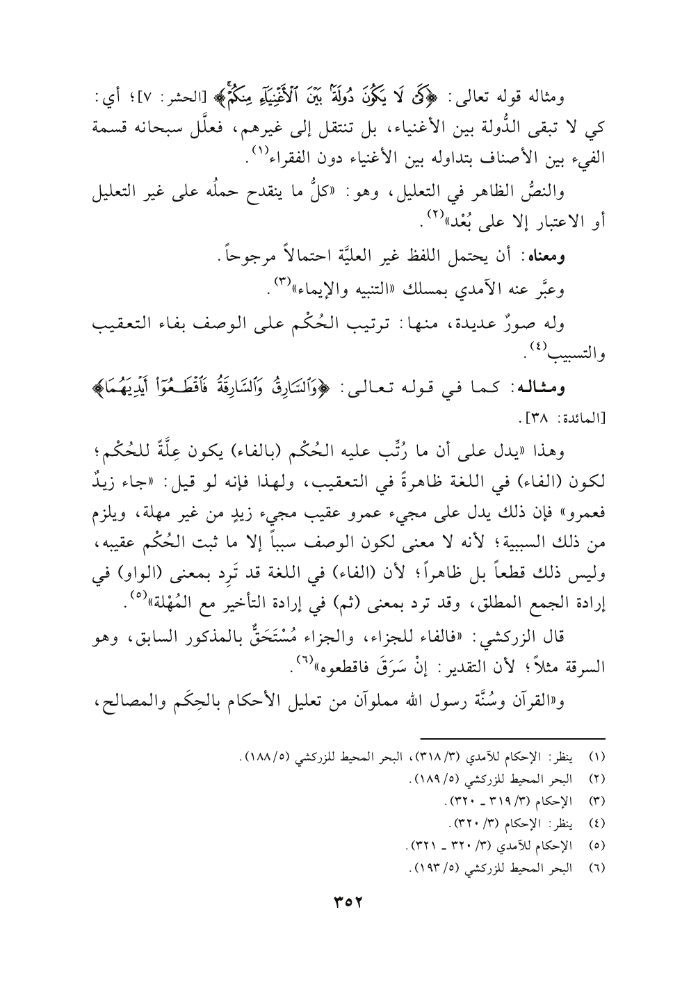 وهذا " يدل على أن ما رُتِّب عليه الحُكْم (بالفاء) يكون عِلَّةً للحُكْم؛ لكون (الفاء) في اللغة ظاهرةً في التعقيب، ولهذا فإنه لو قيل: " جاء زيدٌ فعمرو " فإن ذلك يدل على مجيء عمرو عقيب مجيء زيدٍ من غير مهلة، ويلزم من ذلك السببية؛ لأنه لا معنى لكون الوصف سبباً إلا ما ثبت الحُكْم عقيبه، وليس ذلك قطعاً بل ظاهراً؛ لأن (الفاء) في اللغة قد تَرِد بمعنى (الواو) في إرادة الجمع المطلق، وقد ترد بمعنى (ثم) في إرادة التأخير مع المُهْلة" (٥).