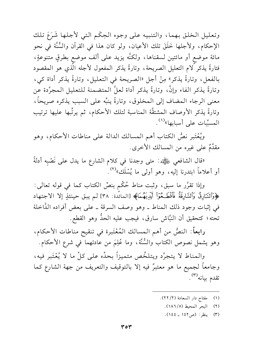ويُعْتَبر نصُّ الكتاب أهم المسالك الدالة على مناطات الأحكام , وهو مقدَّمٌ على غيره من المسالك الأخرى.