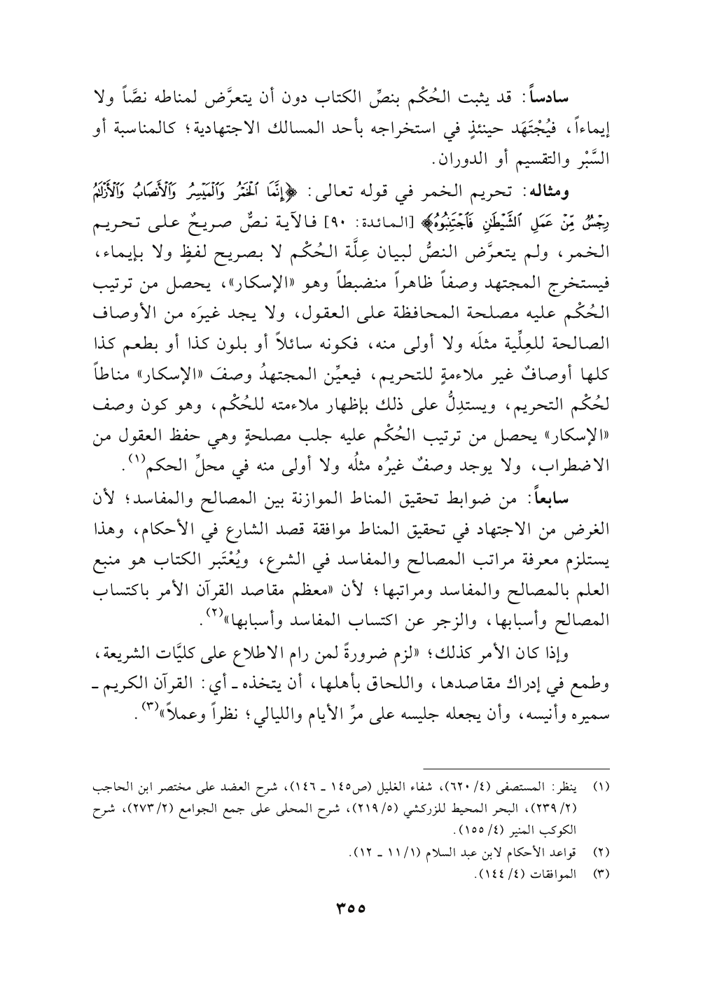 سادساً: قد يثبت الحُكْم بنصِّ الكتاب دون أن يتعرَّض لمناطه نصَّاً ولا إيماءاً, فيُجْتَهَد حينئذٍ في استخراجه بأحد المسالك الاجتهادية , كالمناسبة أو السَّبْر والتقسيم أو الدوران.