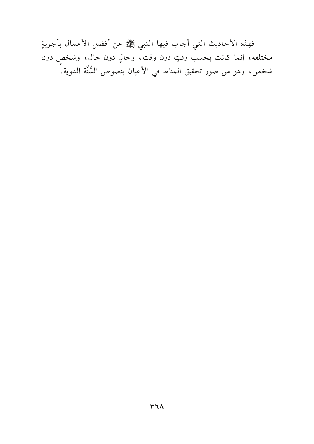 فهذه الأحاديث التي أجاب فيها النبي صلى الله عليه وسلم عن أفضل الأعمال بأجوبةٍ مختلفة، إنما كانت بحسب وقتٍ دون وقت، وحالٍ دون حال، وشخصٍ دون شخص, وهو من صور تحقيق المناط في الأعيان بنصوص السُّنَّة النبوية.