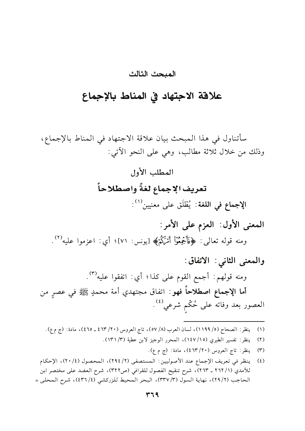 (٤) ينظر في تعريف الإجماع عند الأصوليين: المستصفى (٢/ ٢٩٤) , المحصول (٤/ ٢٠) ,الإحكام للآمدي (١/ ٢٦٢ - ٢٦٣) , شرح تنقيح الفصول للقرافي (٣٢٢) , شرح العضد على مختصر ابن الحاجب (٢/ ٢٩) , نهاية السول (٣/ ٣٣٧) , البحر المحيط للزركشي (٤/ ٤٣٦) ,شرح المحلي على جمع الجوامع (٢/ ١٧٧) , شرح الكوكب المنير (٢/ ٢١١) , تيسير التحرير (٣/ ٢٢٤) , فواتح الرحموت (٢/ ٢٦٠) , إرشاد الفحول (١/ ٣٤٨).