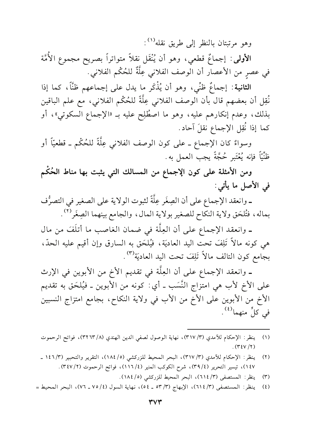 الثانية: إجماعٌ ظنِّي , وهو أن يُذْكَر مايدل على إجماعهم ظنَّاً , كما إذا نُقِل أن بعضهم قال بأن الوصف الفلاني عِلَّةً للحُكْم الفلاني , مع علم الباقين بذلك , وعدم إنكارهم عليه, وهو ما اصطُلِح عليه ب"الإجماع السكوتي" , أو كما إذا نُقِل الإجماع نقلَ آحاد.