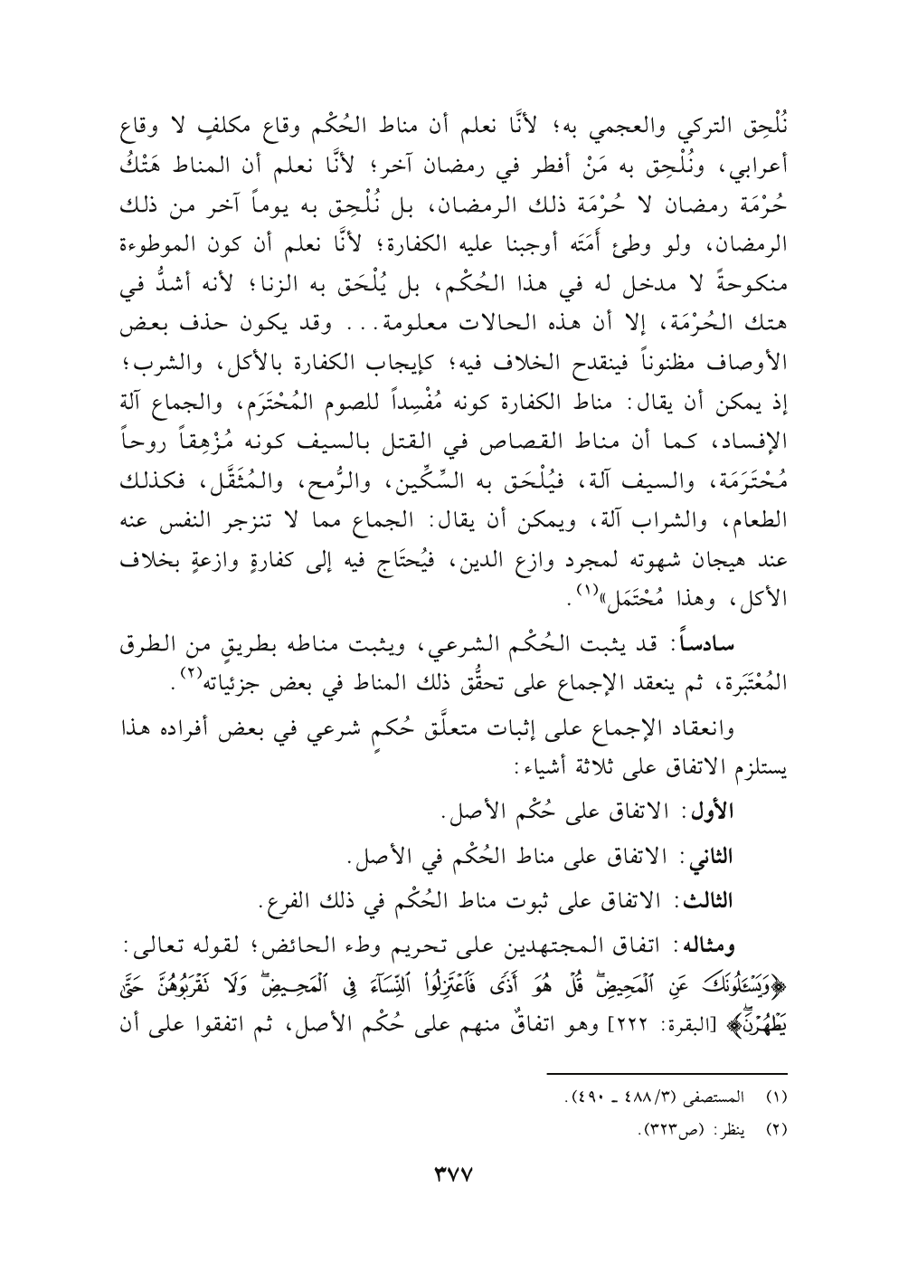 سادسا: قد يثبت الحُكْم الشرعي , ويثبت مناطه بطريقٍ من الطرق المُعْتَبَرة , ثم ينعقد الإجماع على تحقُّق ذلك المناط في بعض جزئياته (٢).