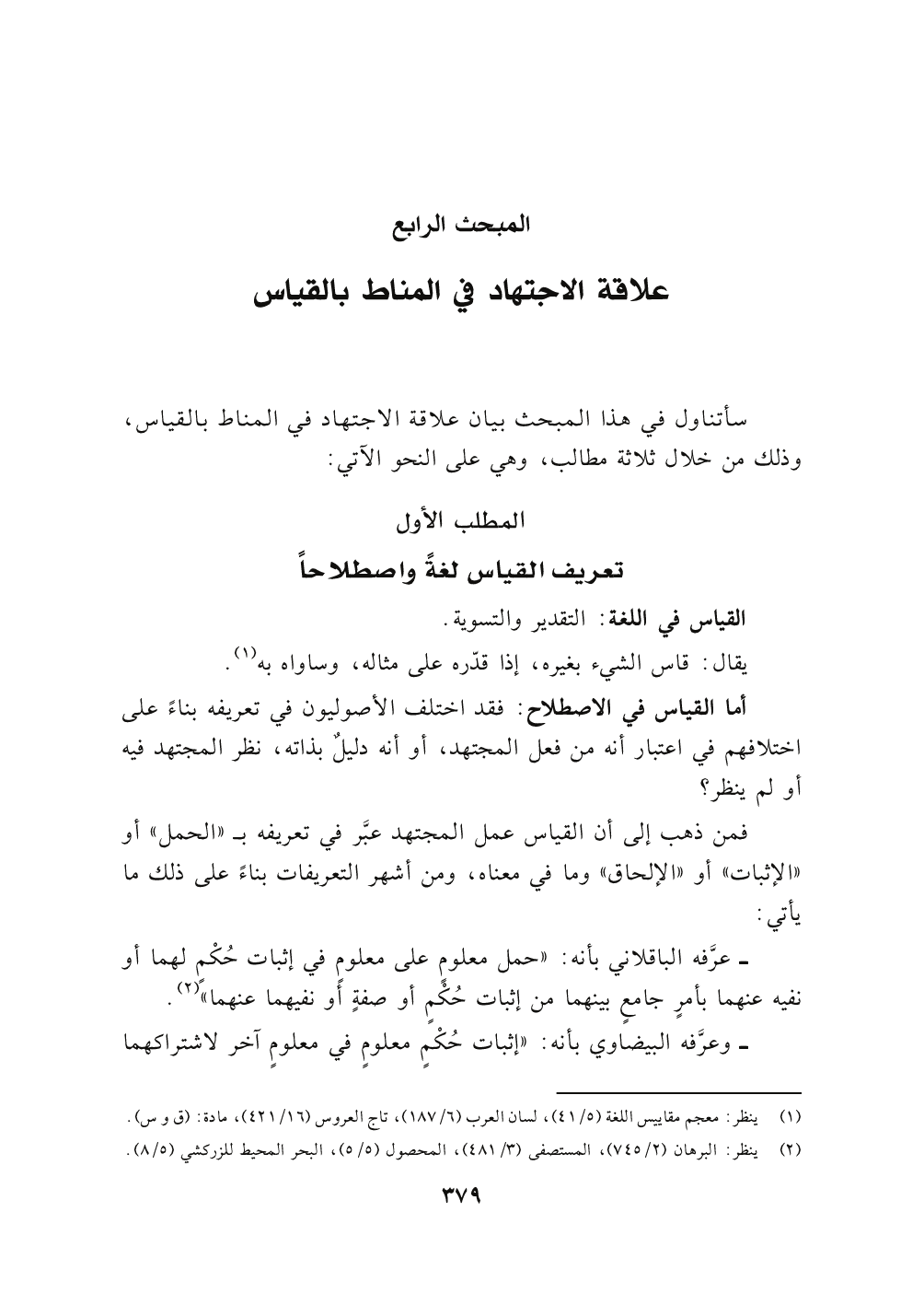 المطلب الأول: تعريف القياس لغةً واصطلاحاً.