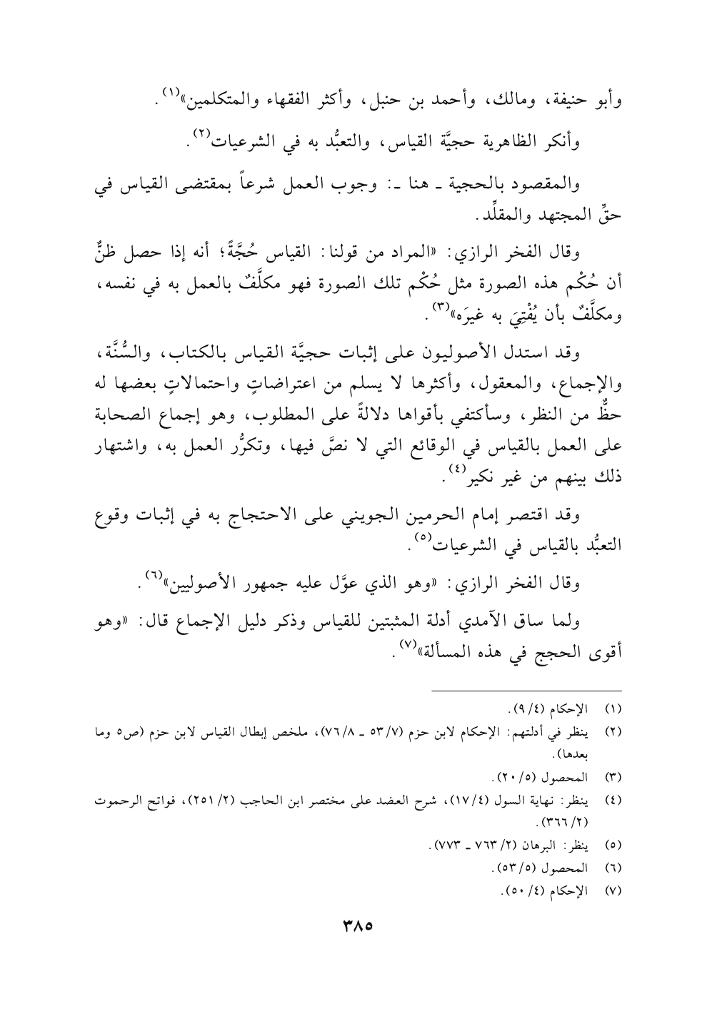 وقال الفخر الرازي: " المراد من قولنا القياس حُجَّةً أنه إذا حصل ظنٌّ أن حُكْم هذه الصورة مثل حُكْم تلك الصورة فهو مكلَّفٌ بالعمل به في نفسه , ومكلَّفٌ بأن يُفْتِىَ به غيرَه " (٣).