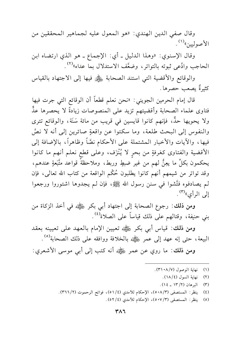 قال إمام الحرمين الجويني: " نحن نعلم قطعاً أن الوقائع التي جرت فيها فتاوى علماء الصحابة وأقضيتهم تزيد على المنصوصات زيادةً لا يحصرها عدٌّ ولا يحويها حدٌّ , فإنهم كانوا قايسين في قريب من مائة سَنَة، والوقائع تترى والنفوس إلى البحث طلعة , وما سكتوا عن واقعةٍ صائرين إلى أنه لا نصَّ فيها، والآيات والأخبار المشتملة على الأحكام نصَّاً وظاهراً , بالإضافة إلى الأقضية والفتاوى كغرفةٍ من بحرٍ لا يُنْزَف، وعلى قطعٍ نعلم أنهم ما كانوا يحكمون بكلِّ ما يعِنُّ لهم من غير ضبطٍ وربط، وملاحظة قواعد متَّبَعةٍ عندهم , وقد تواتر من شيمهم أنهم كانوا يطلبون حُكْم الواقعة من كتاب الله تعالى , فإن لم يصادفوه فتَّشوا في سنن رسول الله صلى الله عليه وسلم, فإن لم يجدوها اشتوروا ورجعوا إلى الرأي" (٣).