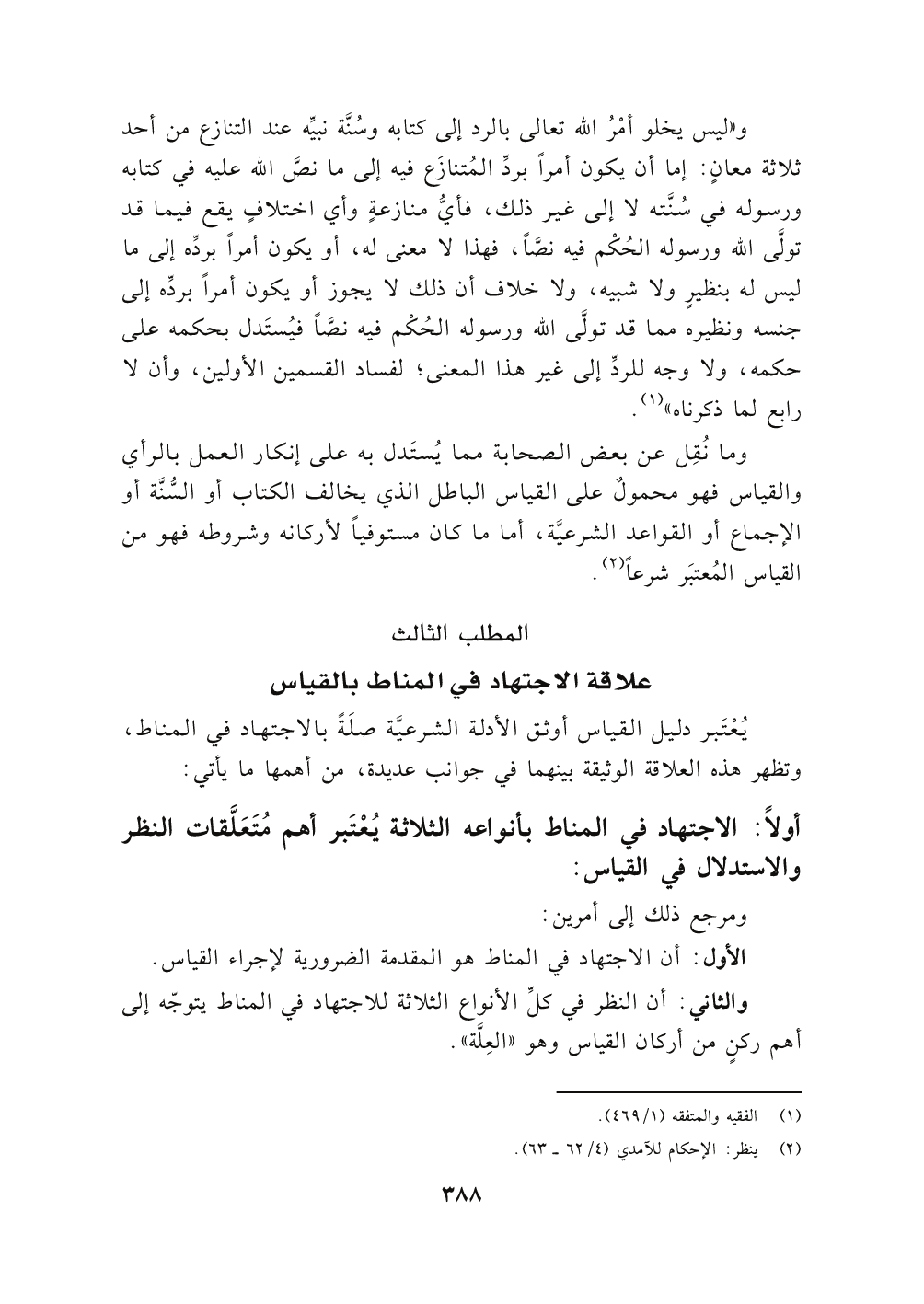 أولا: الاجتهاد في المناط بأنواعه الثلاثة يُعْتَبر أهم مُتَعَلَّقات النظر والاستدلال في القياس، ومرجع ذلك إلى أمرين:
