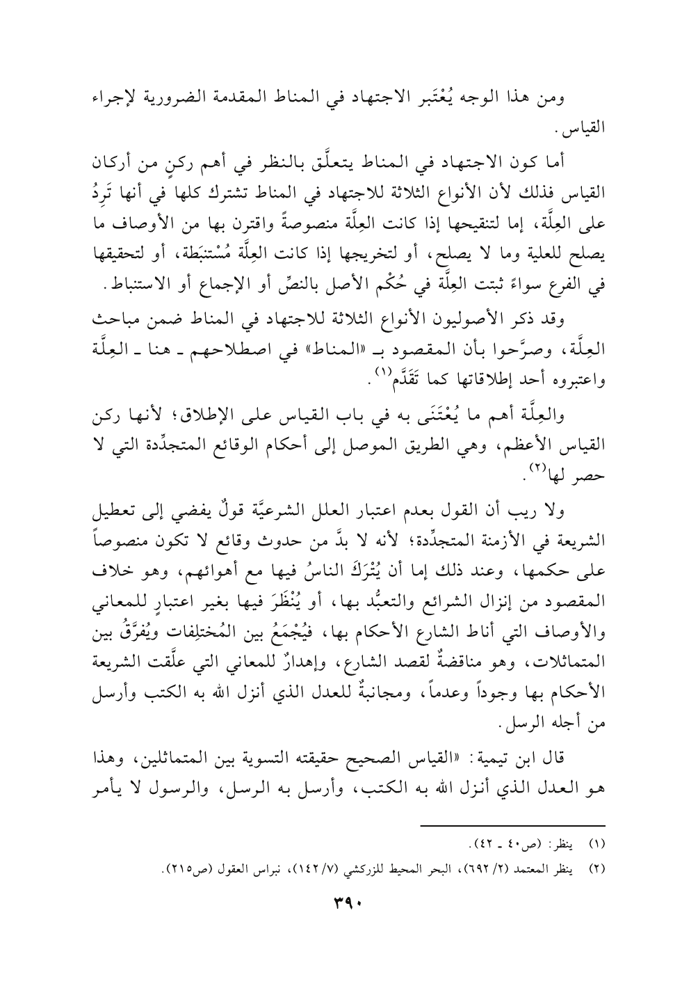 أما كون الاجتهاد في المناط يتعلَّق بالنظر في أهم ركنٍ من أركان القياس فذلك لأن الأنواع الثلاثة للاجتهاد في المناط تشترك كلها في أنها تَرِدُ على العِلَّة، إما لتنقيحها إذا كانت العِلَّة منصوصةً واقترن بها من الأوصاف ما يصلح للعلية وما لا يصلح، أو لتخريجها إذا كانت العِلَّة مُسْتنبَطة، أو لتحقيقها في الفرع سواءً ثبتت العِلَّة في حُكْم الأصل بالنصِّ أو الإجماع أو الاستنباط.
