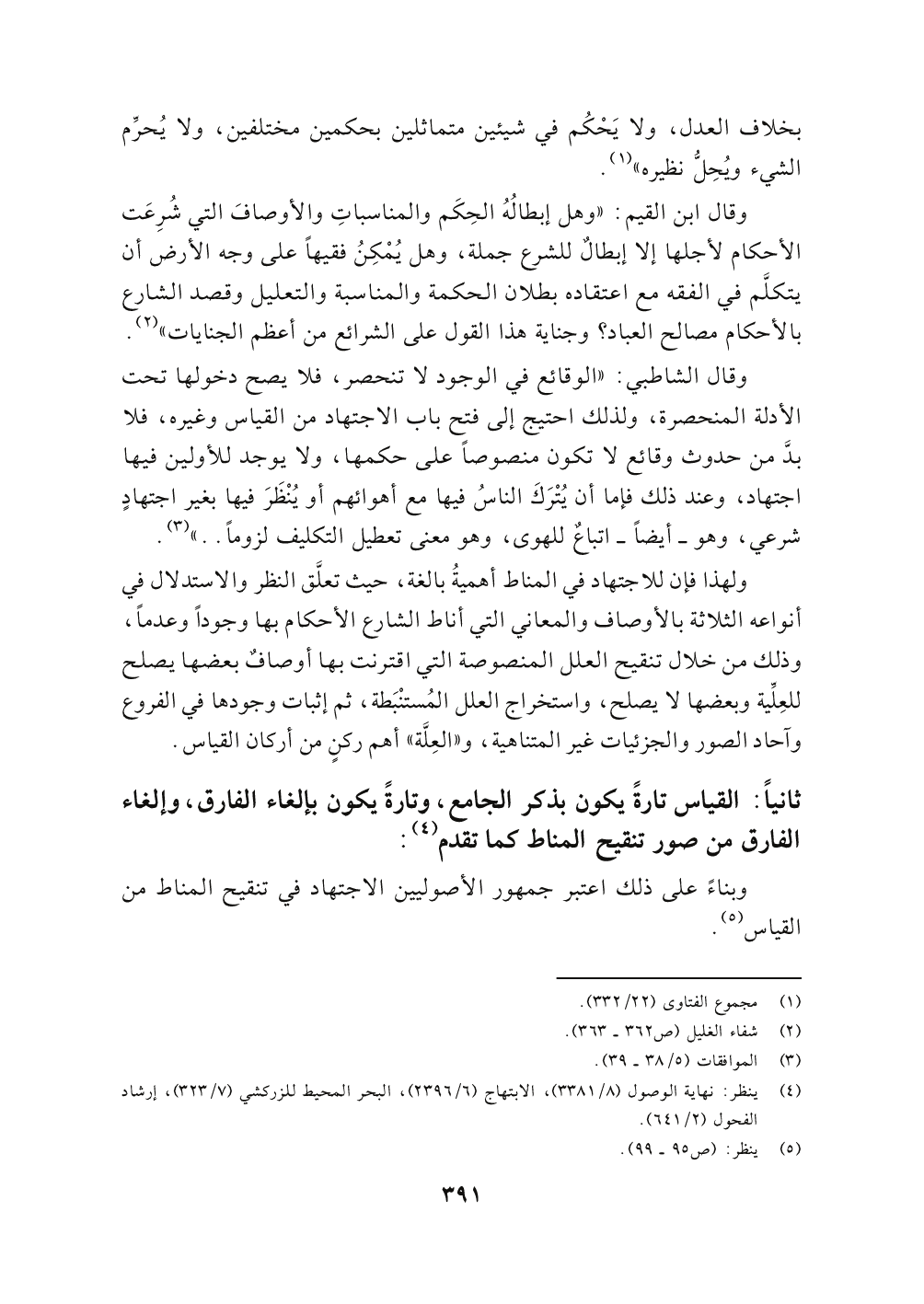 ثانياً: القياس تارةً يكون بذكر الجامع , وتارةً يكون بإلغاء الفارق، وإلغاء الفارق من صور تنقيح المناط كما تقدم (٤).