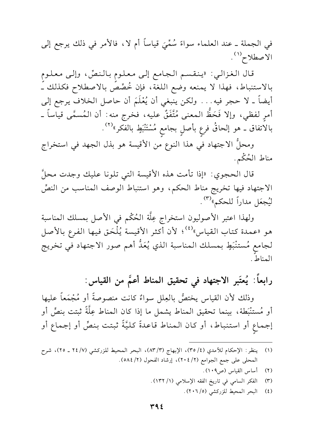 ولهذا اعتبر الأصوليون استخراج عِلَّة الحُكْم في الأصل بمسلك المناسبة هو ... " عمدة كتاب القياس" (٤)؛ لأن أكثر الأقيسة يُلْحَق فيها الفرع بالأصل لجامعٍ مُستنْبَطٍ بمسلك المناسبة الذي يُعَدُّ أهم صور الاجتهاد في تخريج المناط.