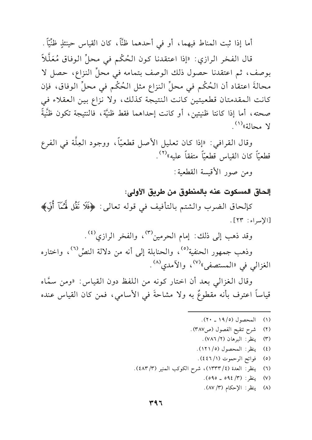 قال الفخر الرازي: "إذا اعتقدنا كون الحُكْم في محلِّ الوفاق مُعَلَّلاً بوصف , ثم اعتقدنا حصول ذلك الوصف بتمامه في محلِّ النزاع , حصل لا محالةَ اعتقاد أن الحُكْم في محلِّ النزاع مثل الحُكْم في محلِّ الوفاق , فإن كانت المقدمتان قطعيتين كانت النتيجة كذلك ,ولا نزاع بين العقلاء في صحته , أما إذا كانتا ظنيتين , أو كانت إحداهما فقط ظنيَّة , فالنتيجة تكون ظنَّيةً لا محالة " (١).