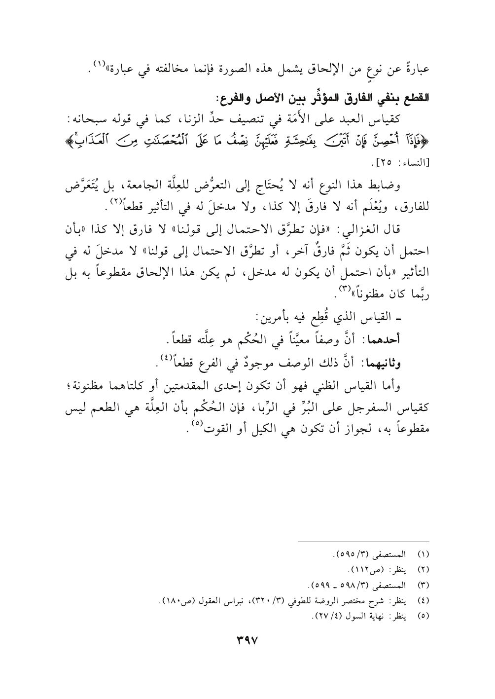 قال الغزالي: " فإن تطرَّق الاحتمال إلى قولنا " لا فارق إلا كذا" بأن احتمل أن يكون ثَمَّ فارقٌ آخر، أو تطرَّق الاحتمال إلى قولنا " لا مدخلَ له في التأثير " بأن احتمل أن يكون له مدخل، لم يكن هذا الإلحاق مقطوعاً به بل ربَّما كان مظنوناً" (٣).