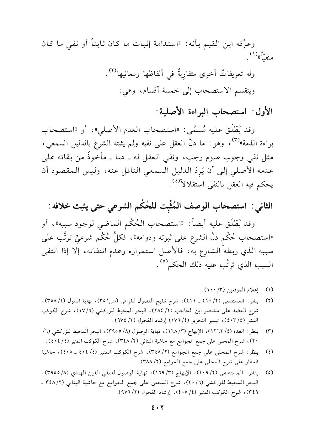 وعرَّفه ابن القيم بأنه: " إستدامة إثبات ما كان ثابتاً أو نفي ما كان منفياً" (١).