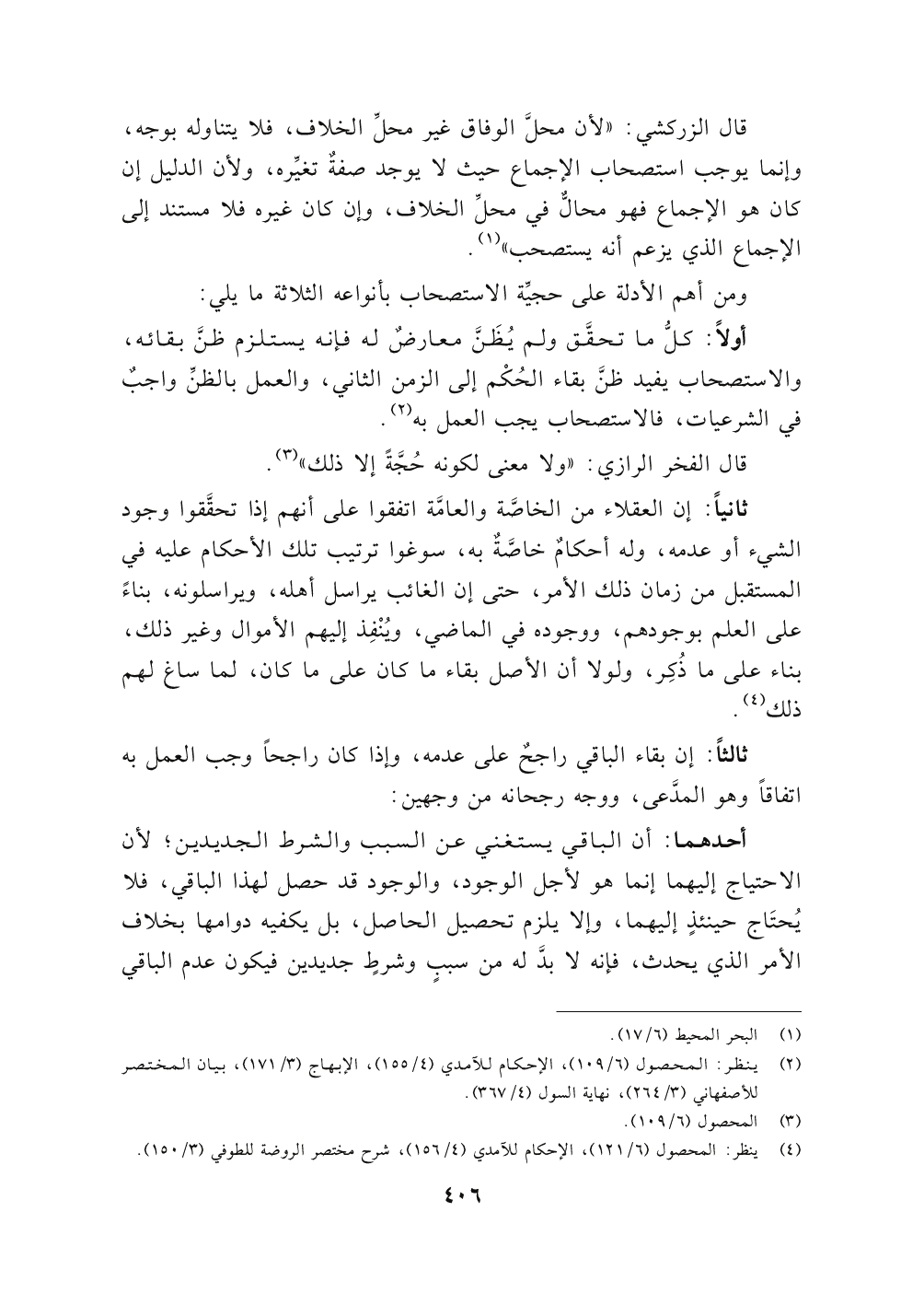 قال الزركشي: " لأن محلَّ الوفاق غير محلِّ الخلاف، فلا يتناوله بوجه، وإنما يوجب استصحاب الإجماع حيث لا يوجد صفةٌ تغيِّره، ولأن الدليل إن كان هو الإجماع فهو محالٌّ في محلِّ الخلاف، وإن كان غيره فلا مستند إلى الإجماع الذي يزعم أنه يستصحب" (١).