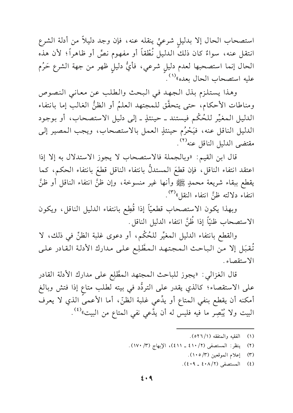 وهذا يستلزم بذل الجهد في البحث والطلب عن معاني النصوص ومناطات الأحكام, حتى يتحقَّق للمجتهد العلمُ أو الظنُّ الغالب إما بانتفاء الدليل المغيِّر للحُكْم فيستند - حينئذٍ- إلى دليل الاستصحاب , أو بوجود الدليل الناقل عنه , فيَحْرُم حينئذٍ العمل بالاستصحاب , ويجب المصير إلى مقتضى الدليل الناقل عنه (٢).
