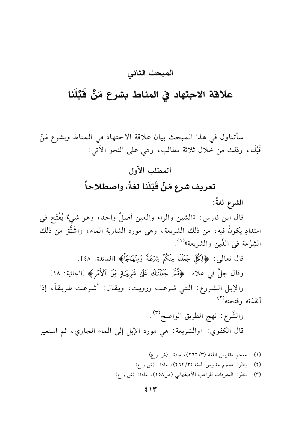 (٢) ينظر: معجم مقاييس اللغة (٣/ ٢٦٢) "مادة: ش ر ع".