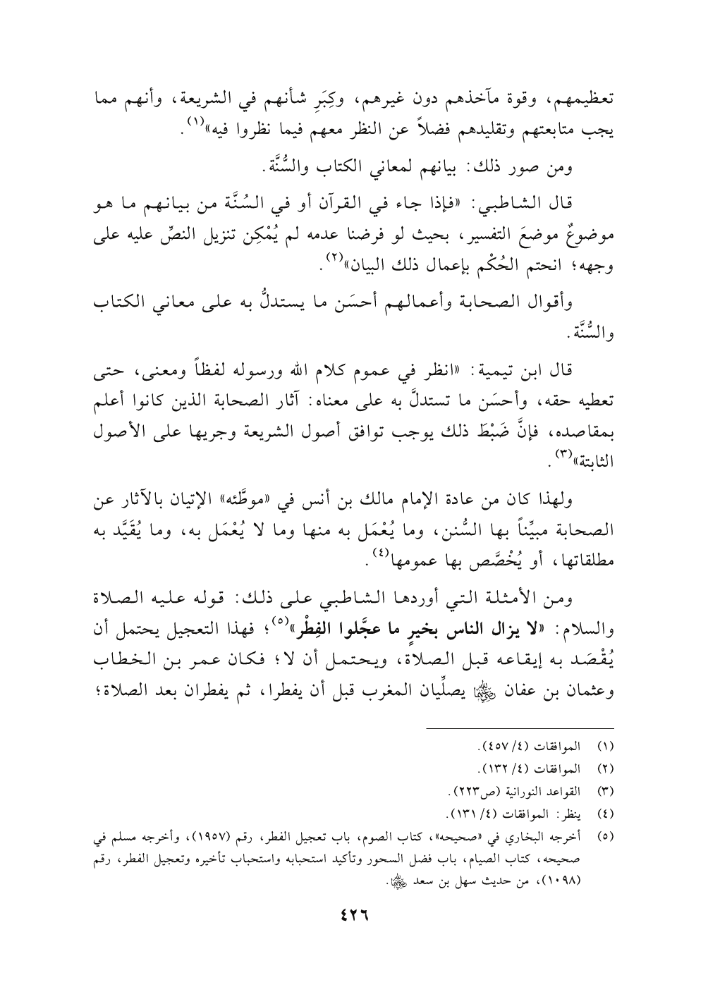 ولهذا كان من عادة الإمام مالك بن أنس في "موطَّئه" الإتيان بالآثار عن الصحابة مبيِّناً بها السُّنن، وما يُعْمَل به منها وما لا يُعْمَل به، وما يُقَيَّد به مطلقاتها، أو يُخْصَّص بها عمومها (٤).
