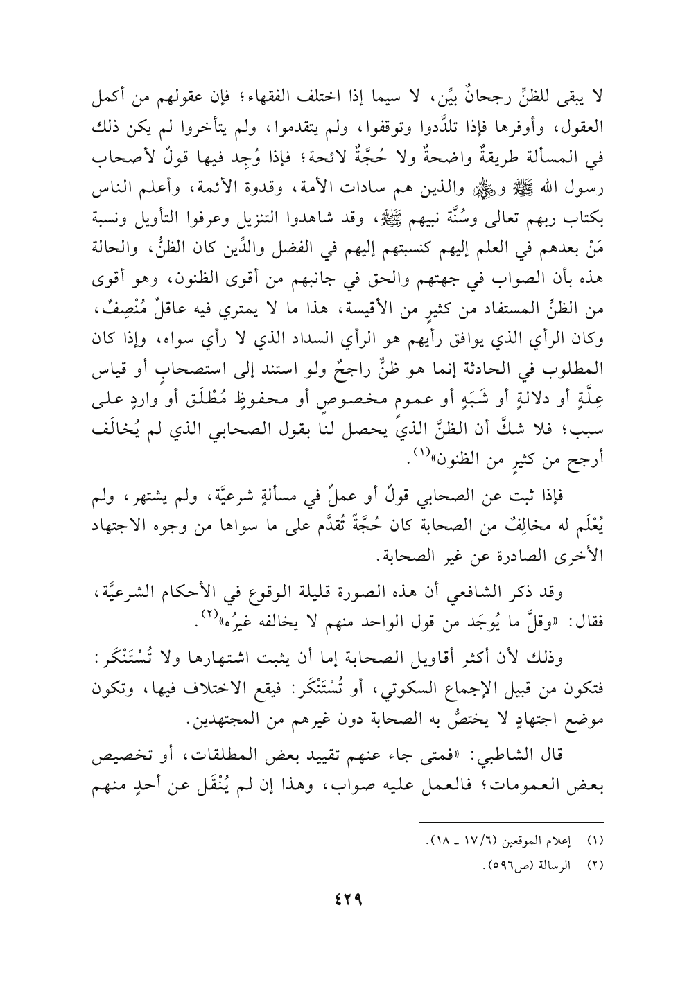 لا يبقى للظنِّ رجحانٌ بيَّن، لا سيما إذا اختلف الفقهاء؛ فإن عقولهم من أكمل العقول، وأوفرها فإذا تلدَّدوا وتوقفوا، ولم يتقدموا، ولم يتأخروا لم يكن ذلك في المسألة طريقةٌ واضحةٌ ولا حُجَّةٌ لائحة؛ فإذا وُجِد فيها قولٌ لأصحاب رسول الله - صلى الله عليه وسلم - ورضي الله عنهم والذين هم سادات الأمة، وقدوة الأئمة، وأعلم الناس بكتاب ربهم تعالى وسُنَّة نبيهم - صلى الله عليه وسلم -، وقد شاهدوا التنزيل وعرفوا التأويل ونسبة مَنْ بعدهم في العلم إليهم كنسبتهم إليهم في الفضل والدِّين كان الظنُّ والحالة هذه بأن الصواب في جهتهم والحق في جانبهم من أقوى الظنون، وهو أقوى من الظنِّ المستفاد من كثيرٍ من الأقيسة، هذا ما لا يمتري فيه عاقلٌ مُنْصِفٌ، وكان الرأي الذي يوافق رأيهم هو الرأي السداد الذي لا رأي سواه، وإذا كان المطلوب في الحادثة إنما هو ظنٌّ راجحٌ ولو استند إلى استصحابٍ أو قياس عِلَّةٍ أو دلالةٍ أو شَبَهٍ أو عمومٍ مخصوصٍ أو محفوظٍ مُطْلَق أو واردٍ على سبب؛ فلا شكَّ أن الظنَّ الذي يحصل لنا بقول الصحابي الذي لم يُخالَف أرجح من كثيرٍ من الظنون " (١).