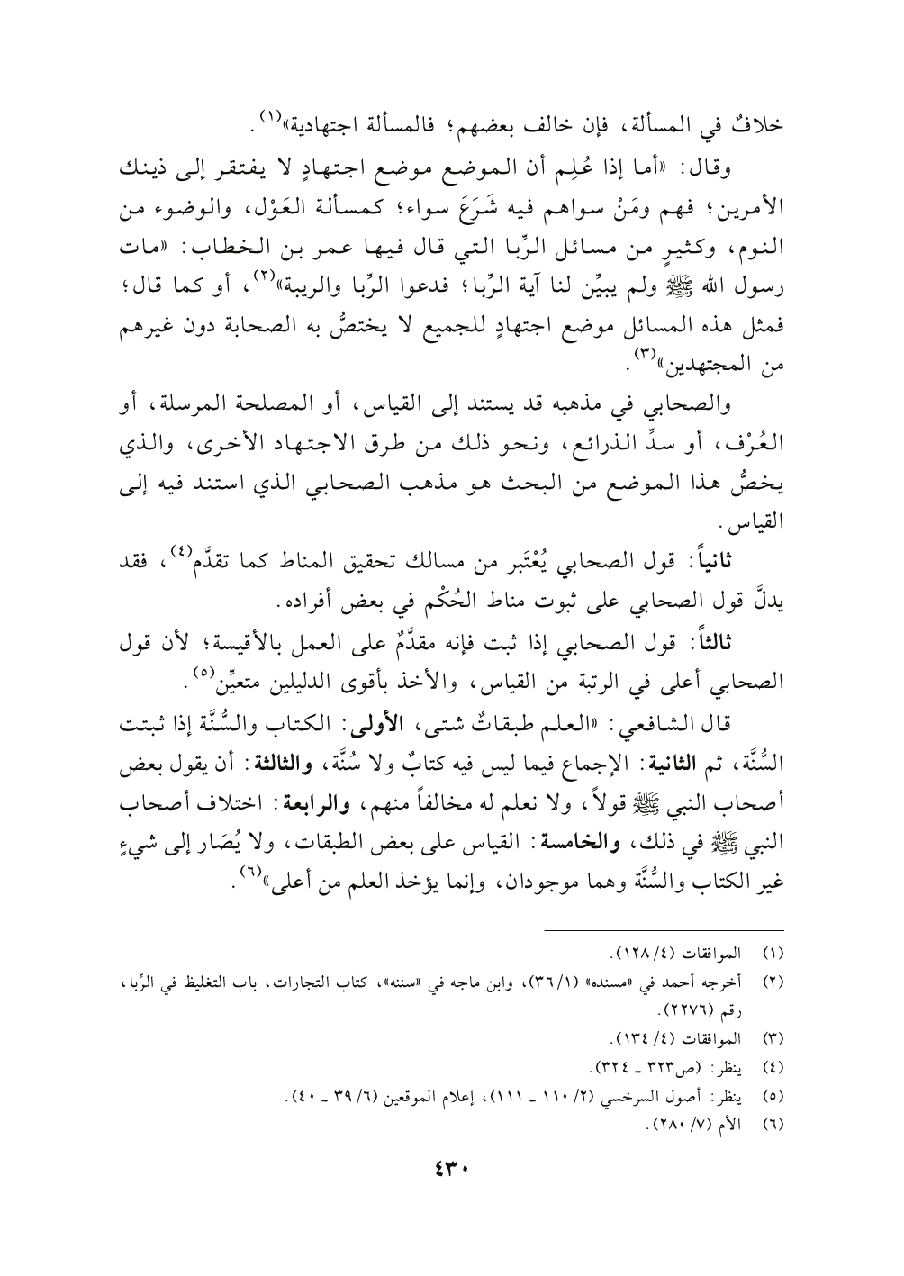 وقال: " أما إذا عُلِم أن الموضع موضع اجتهادٍ لا يفتقر إلى ذينك الأمرين؛ فهم ومَنْ سواهم فيه شَرَعَ سواء؛ كمسألة العَوْل، والوضوء من النوم، وكثيرٍ من مسائل الرِّبا التي قال فيها عمر بن الخطاب: "مات رسول الله صلى الله عليه وسلم ولم يبيِّن لنا آية الرِّبا؛ فدعوا الرِّبا والريبة" (٢)، أو كما قال؛ فمثل هذه المسائل موضع اجتهادٍ للجميع لا يختصُّ به الصحابة دون غيرهم من المجتهدين" (٣).