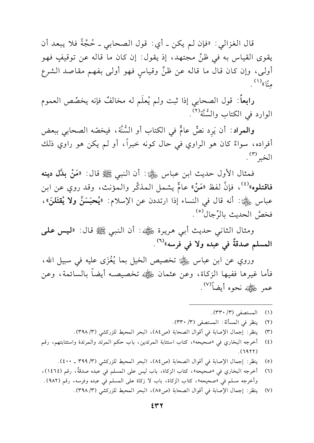 رابعاً: قول الصحابي إذا ثبت ولم يُعلَم له مخالفٌ فإنه يخصِّص العموم الوارد في الكتاب والسُّنَّة (٢).