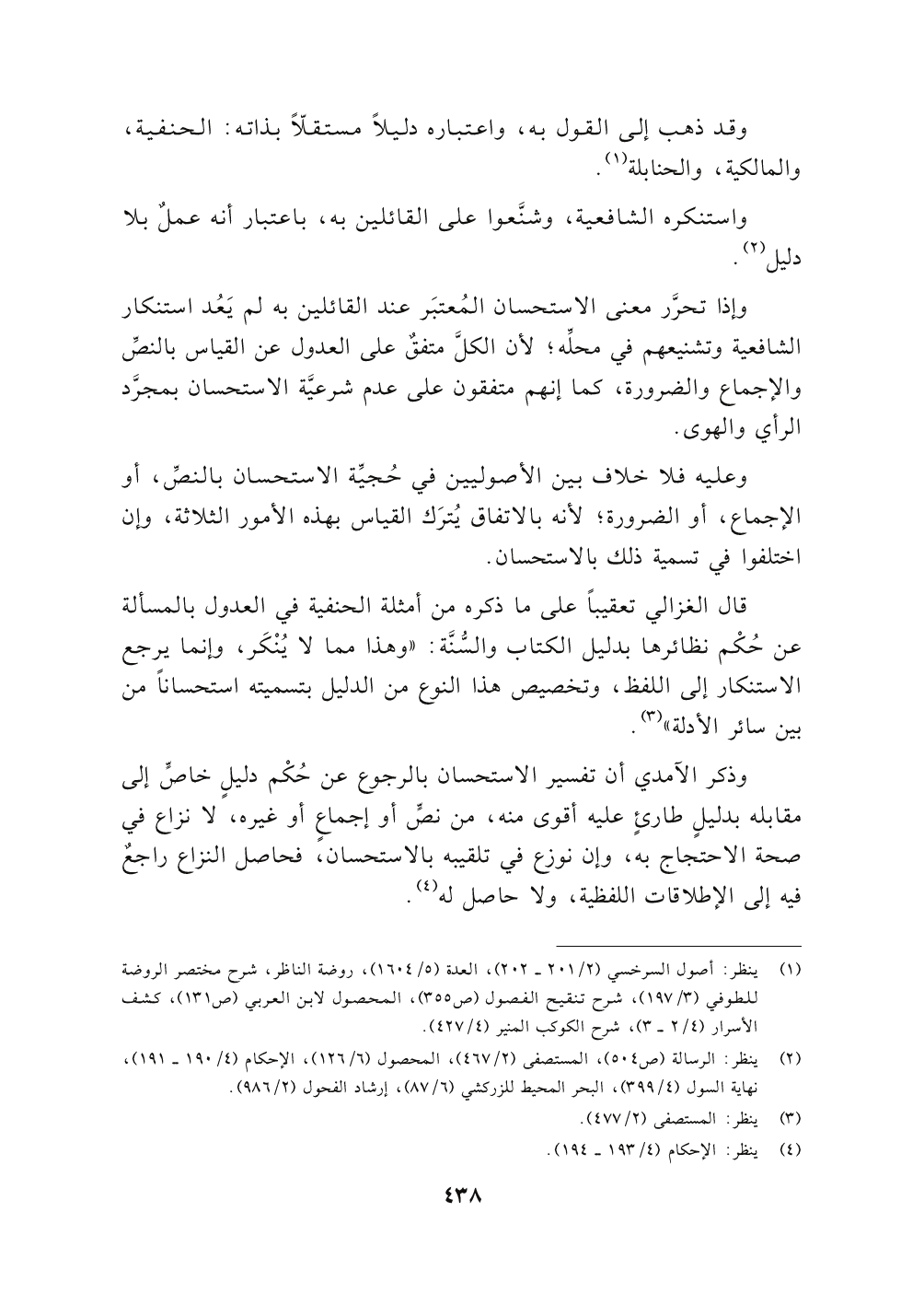 وذكر الآمدي أن تفسير الاستحسان بالرجوع عن حُكْم دليلٍ خاصٍّ إلى مقابله بدليلٍ طارئٍ عليه أقوى منه , من نصٍّ أو إجماعٍ أو غيره , لا نزاع في صحة الاحتجاج به، وإن نوزع في تلقيبه بالاستحسان , فحاصل النزاع راجعٌ فيه إلى الإطلاقات اللفظية، ولا حاصل له (٤).