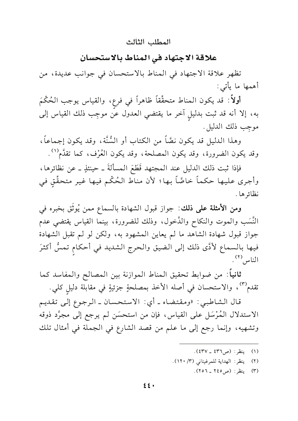 ثانياً: من ضوابط تحقيق المناط الموازنة بين المصالح والمفاسد كما تقدم (٣) , والاستحسان في أصله الأخذ بمصلحةٍ جزئيةٍ في مقابلة دليلٍ كلي.