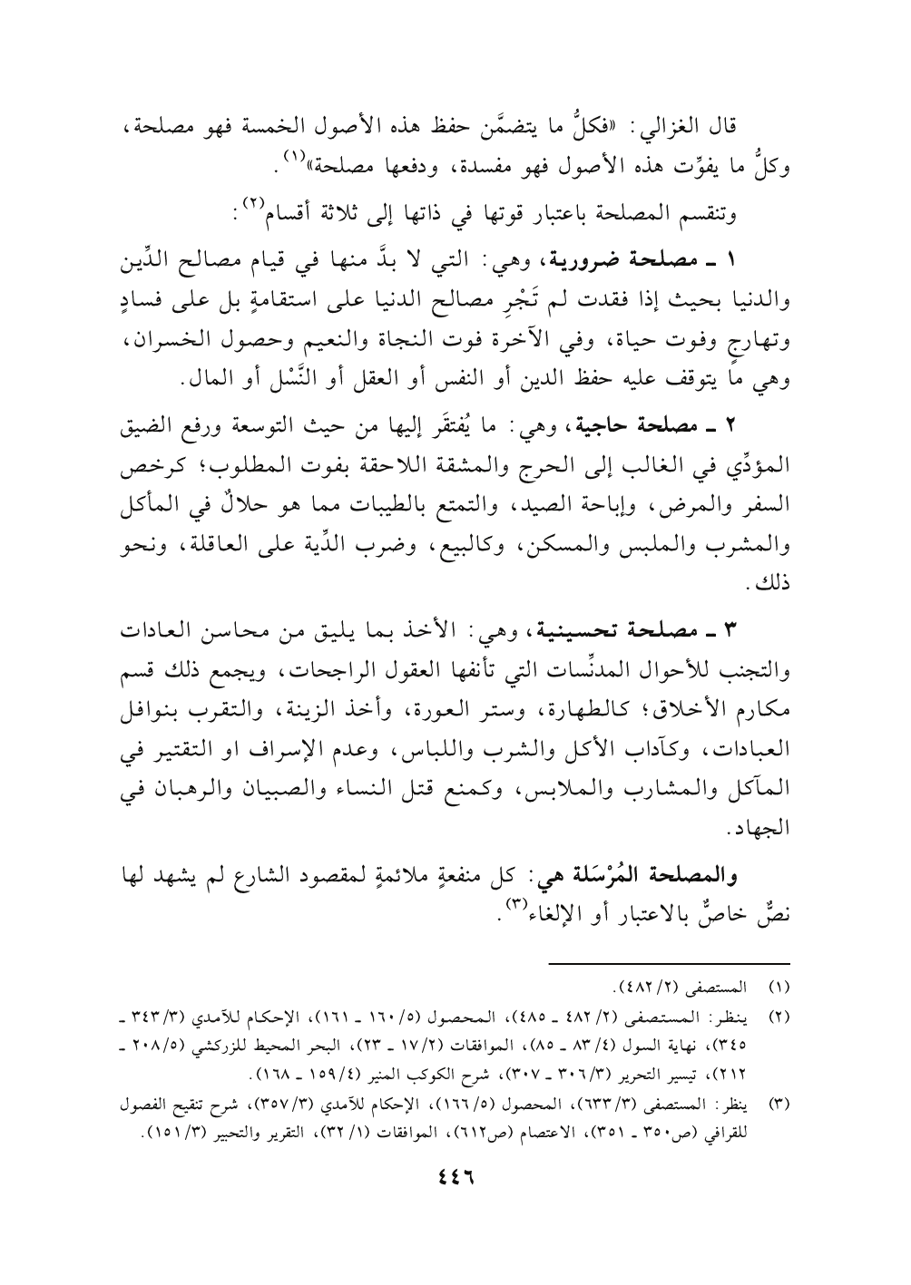 وتنقسم المصلحة باعتبار قوتها في ذاتها إلى ثلاثة أقسام (٢):