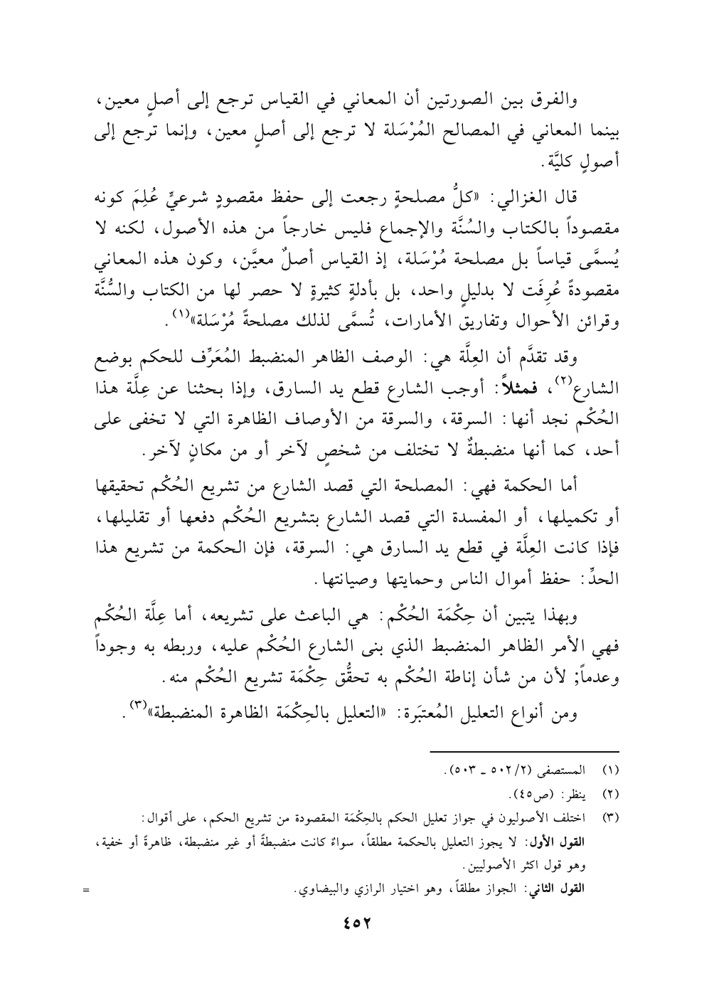 ومن أنواع التعليل المُعتبَرة: "التعليل بالحِكْمَة الظاهرة المنضبطة" (٣).