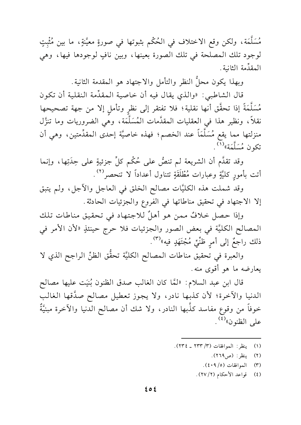 وإذا حصل خلافٌ ممن هو أهلٌ للاجتهاد في تحقيق مناطات تلك المصالح الكليَّة في بعض الصور والجزئيات فلاحرج حينئذٍ" لأن الأمر في ذلك راجعٌ إلى أمرٍ ظنِّيِّ مُجْتَهَدٍ فيه" (٣).