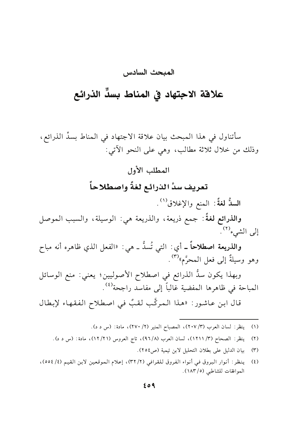 المطلب الأول: تعريف سدِّ الذرائع لغةً واصطلاحاً.