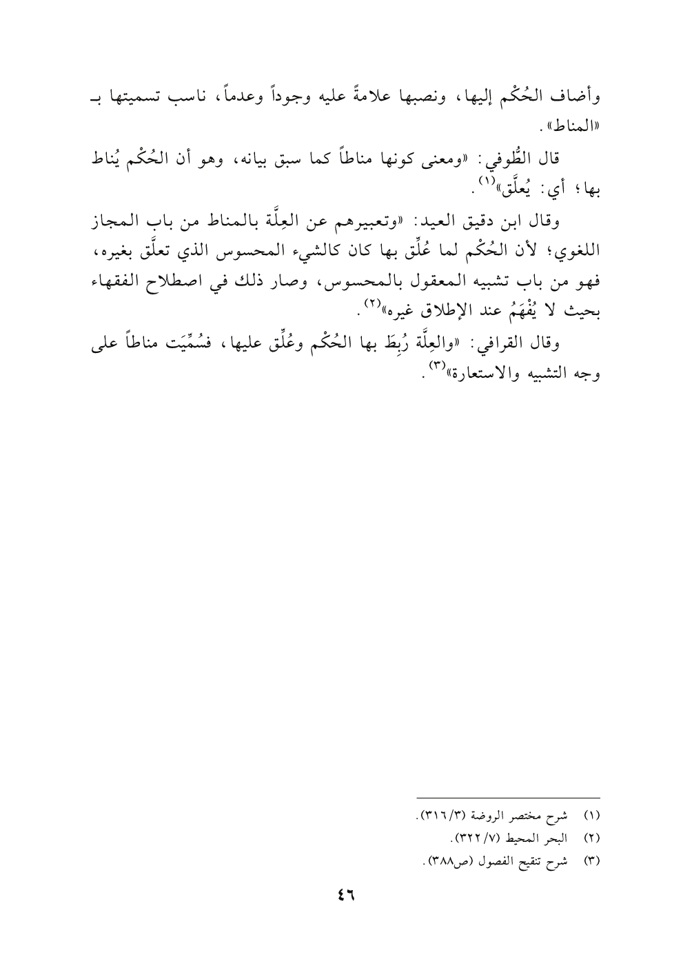 وقال ابن دقيق العيد: " وتعبيرهم عن العِلَّة بالمناط من باب المجاز اللغوي؛ لأن الحُكْم لما عُلِّق بها كان كالشيء المحسوس الذي تعلَّق بغيره، فهو من باب تشبيه المعقول بالمحسوس، وصار ذلك في اصطلاح الفقهاء بحيث لا يُفْهَمُ عند الإطلاق غيره " (٢).