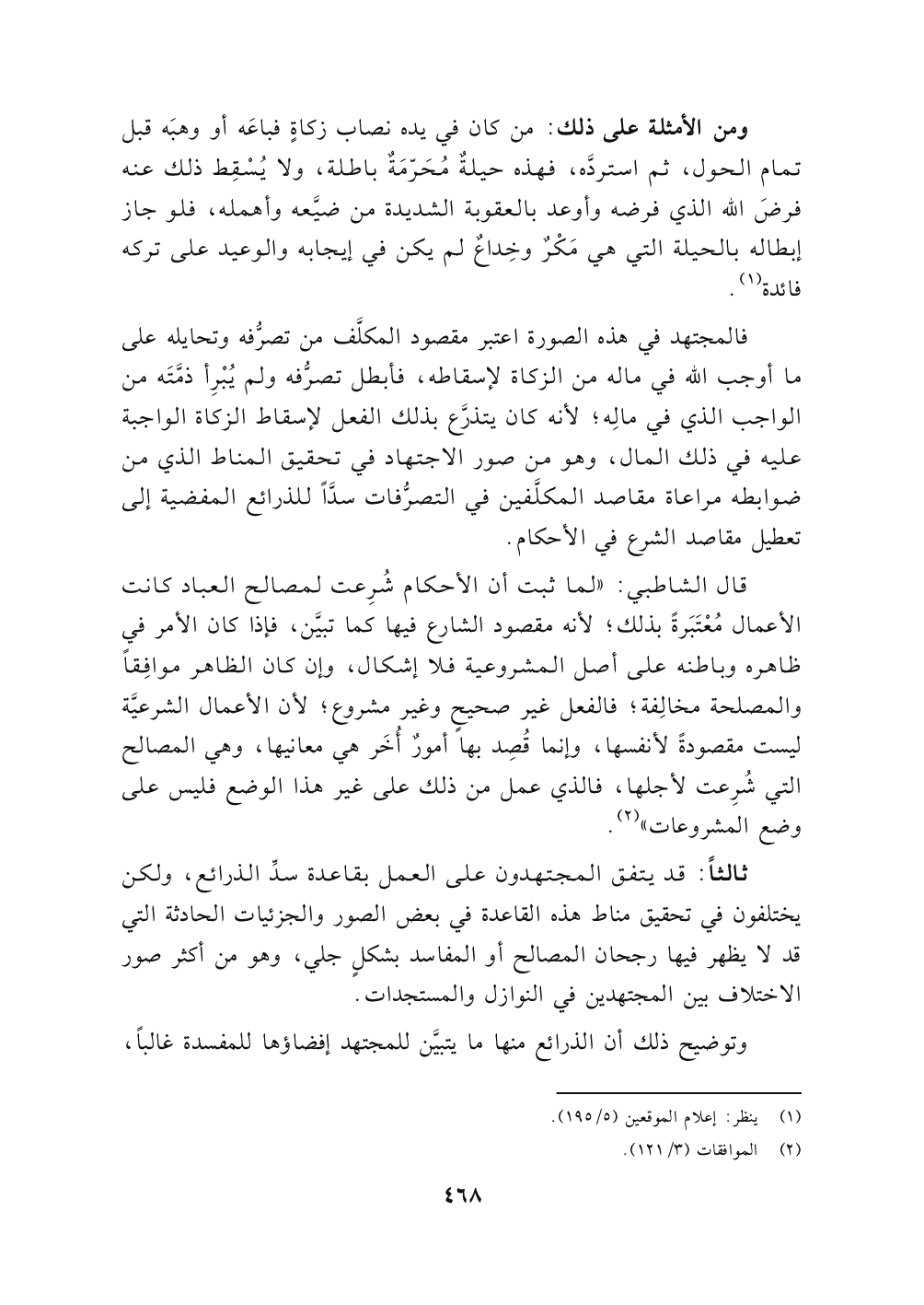 فالمجتهد في هذه الصورة اعتبر مقصود المكلَّف من تصرُّفه وتحايله على ما أوجب الله في ماله من الزكاة لإسقاطه , فأبطل تصرُّفه ولم يُبْرِأ ذمَّتَه من الواجب الذي في مالِه؛ لأنه كان يتذرَّع بذلك الفعل لإسقاط الزكاة الواجبة عليه في ذلك المال, وهو من صور الاجتهاد في تحقيق المناط الذي من ضوابطه مراعاة مقاصد المكلَّفين في التصرُّفات سدَّاً للذرائع المفضية إلى تعطيل مقاصد الشرع في الأحكام.