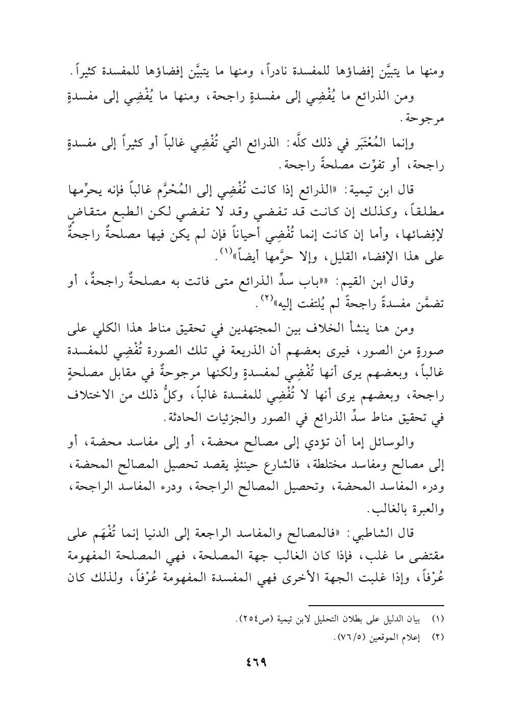 وإنما المُعْتَبَر في ذلك كلَّه: الذرائع التي تُفْضِي غالباً أو كثيراً إلى مفسدةٍ راجحة , أو تفوِّت مصلحةً راجحة.