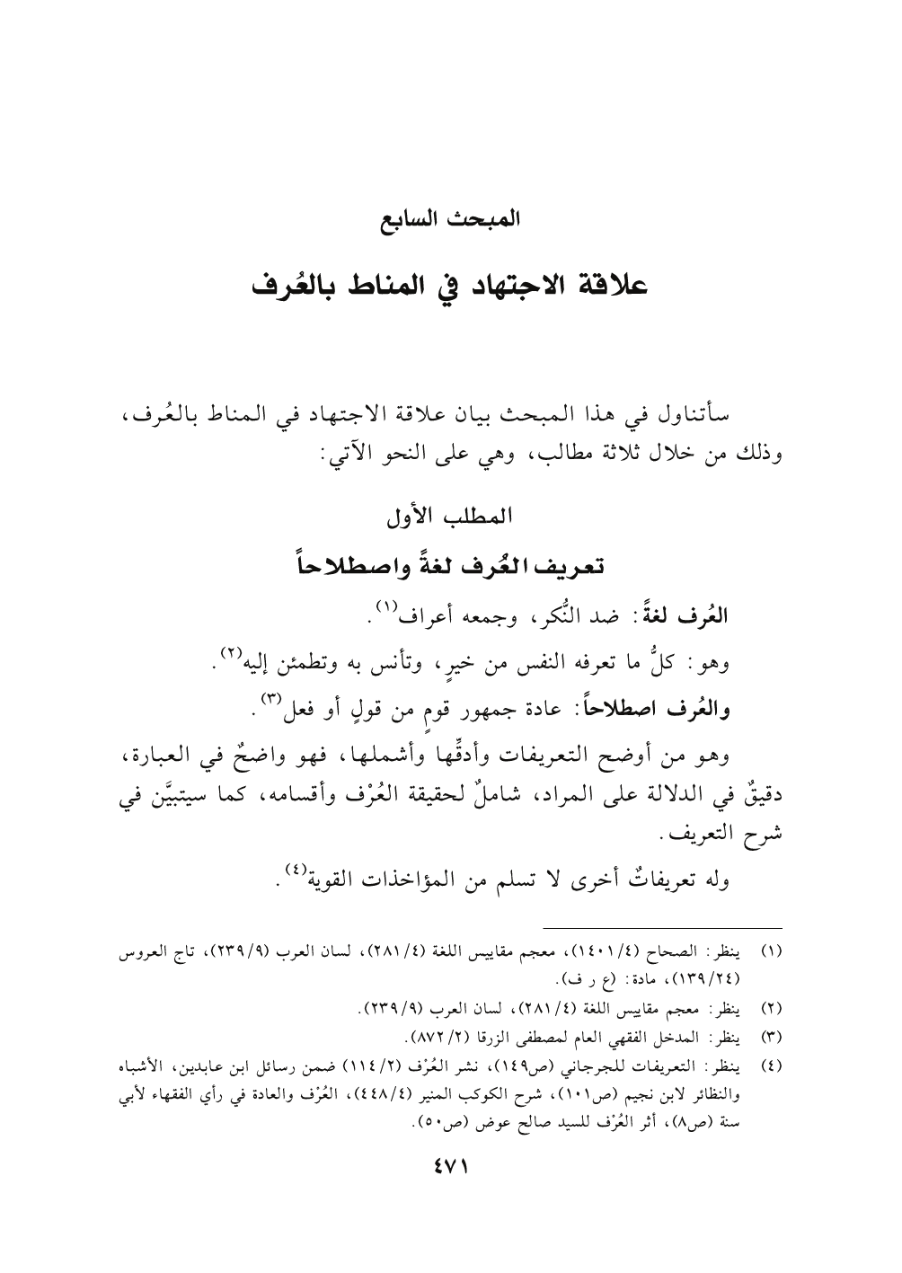 (٤) ينظر: التعريفات للجرجاني (١٤٩) , نشر العَرْف (٢/ ١١٤) ضمن رسائل ابن عابدين, الأشباه والنظائر لابن نجيم (١٠١) ,شرح الكوكب المنير (٤/ ٤٤٨) ,العُرْف والعادة في رأي الفقهاء لأبي سنة (٨ - ) ,أثر العُرْف للسيد صالح عوض (٥٠ - ).