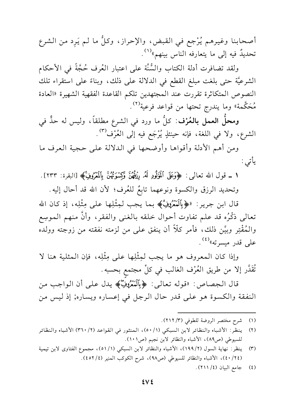 ولقد تظافرت أدلة الكتاب والسُّنَّة على اعتبار العُرف حُجَّةً في الأحكام الشرعيَّة حتى بلغت مبلغ القطع في الدلالة على ذلك , وبناءً على استقراء تلك النصوص المتكاثرة تقررت عند المجتهدين تلكم القاعدة الفقهية الشهيرة "العادة مُحَكَّمة" وما يندرج تحتها من قواعد فرعية (٢).