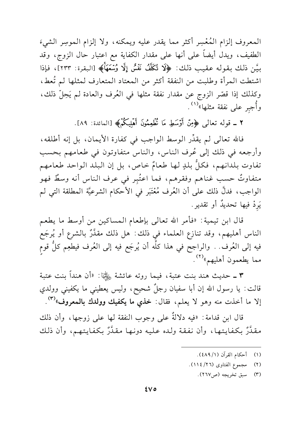 ٣ - حديث هند بنت عتبة، فيما روته عائشة رضي الله عنها: "أن هنداً بنت عتبة قالت: يا رسول الله إن أبا سفيان رجلٌ شحيح، وليس يعطيني ما يكفيني وولدي إلا ما أخذت منه وهو لا يعلم، فقال: خذي ما يكفيك وولدك بالمعروف" (٣).