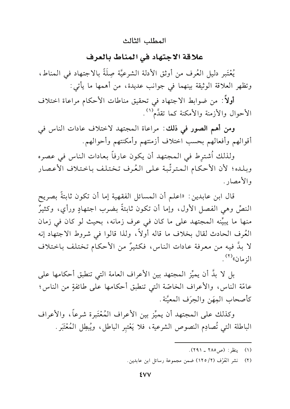 قال ابن عابدين: "اعلم أن المسائل الفقهية إما أن تكون ثابتةً بصريح النصِّ وهي الفصل الأول، وإما أن تكون ثابتةً بضرب اجتهادٍ ورأي، وكثيرٌ منها ما يبيِّنه المجتهد على ما كان في عرف زمانه, بحيث لو كان في زمان العُرف الحادث لقال بخلاف ما قاله أولاً، ولذا قالوا في شروط الاجتهاد إنه لابدَّ فيه من معرفة عادات الناس، فكثيرٌ من الأحكام تختلف باختلاف الزمان" (٢).