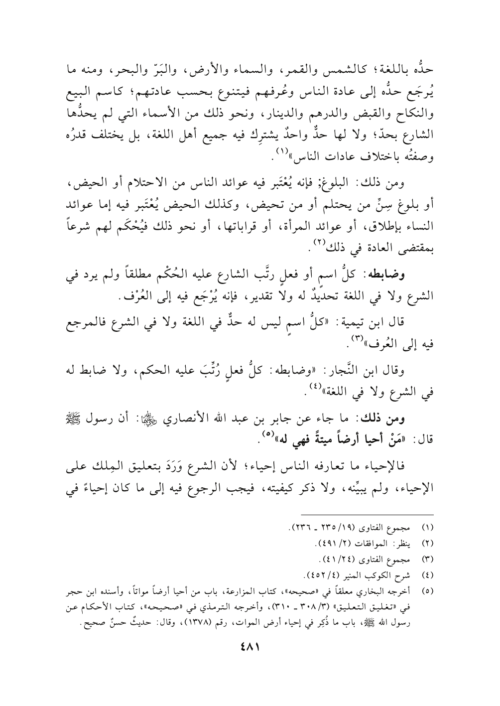 قال ابن تيمية: "كلُّ اسمٍ ليس له حدٌّ في اللغة ولا في الشرع فالمرجع فيه إلى العُرف " (٣).