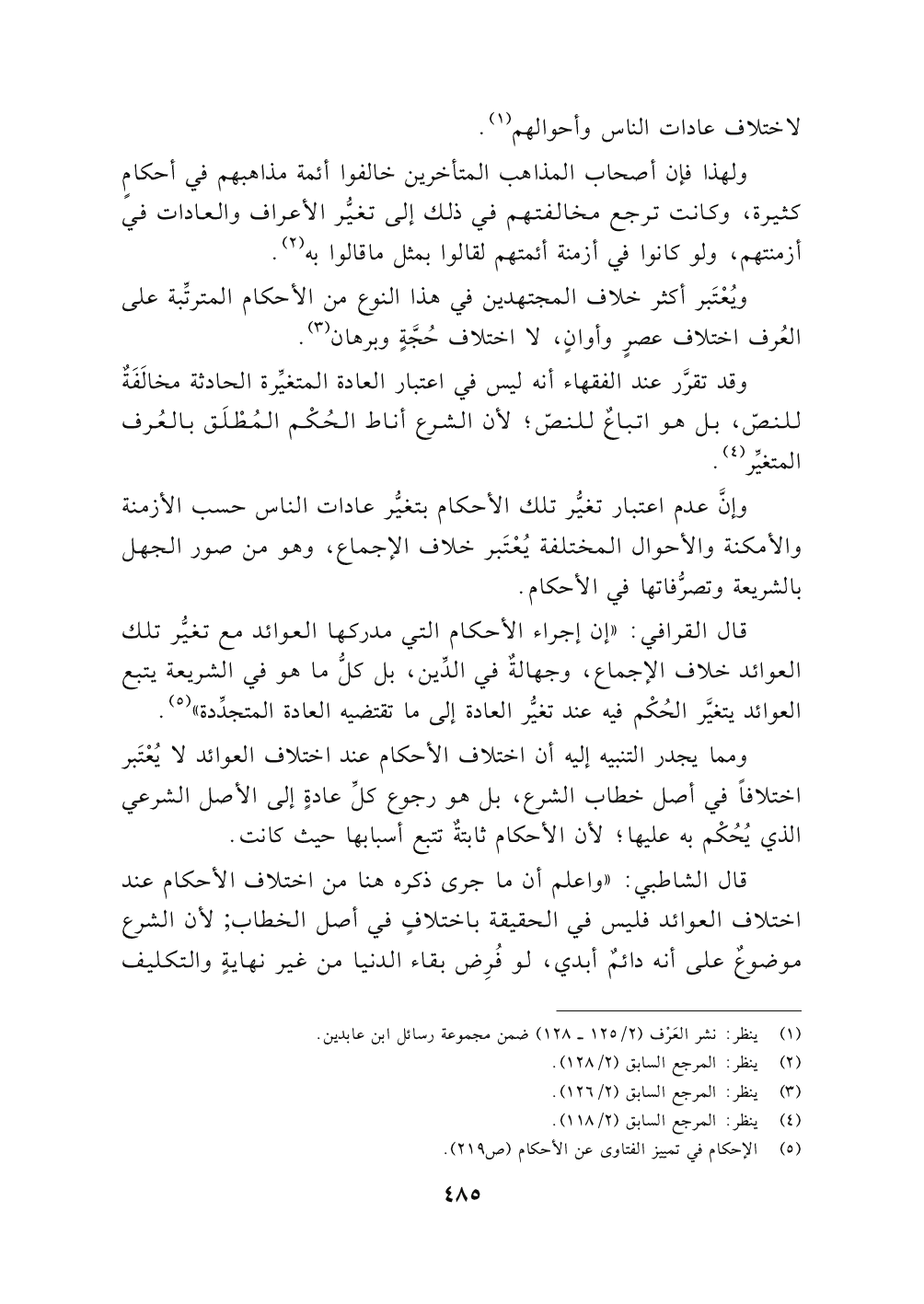 قال القرافي: " إن إجراء الأحكام التي مدركها العوائد مع تغيُّر تلك العوائد خلاف الإجماع، وجهالةٌ في الدِّين، بل كلُّ ما هو في الشريعة يتبع العوائد يتغيَّر الحُكْم فيه عند تغيُّر العادة إلى ما تقتضيه العادة المتجدِّدة" (٥).