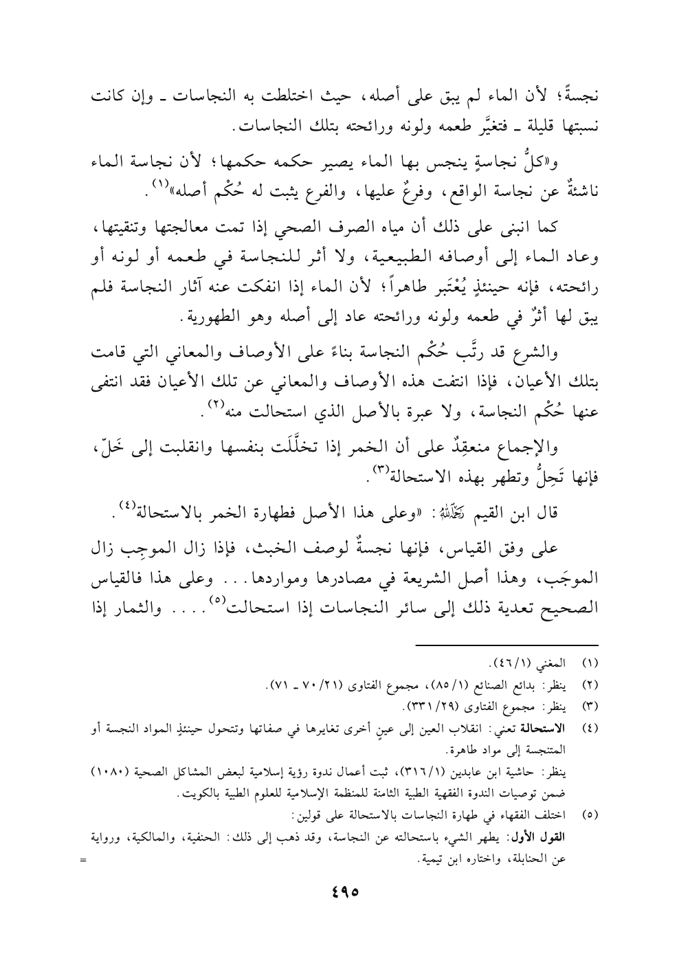 قال ابن القيم رحمه الله: "وعلى هذا الأصل فطهارة الخمر بالاستحالة (٤)