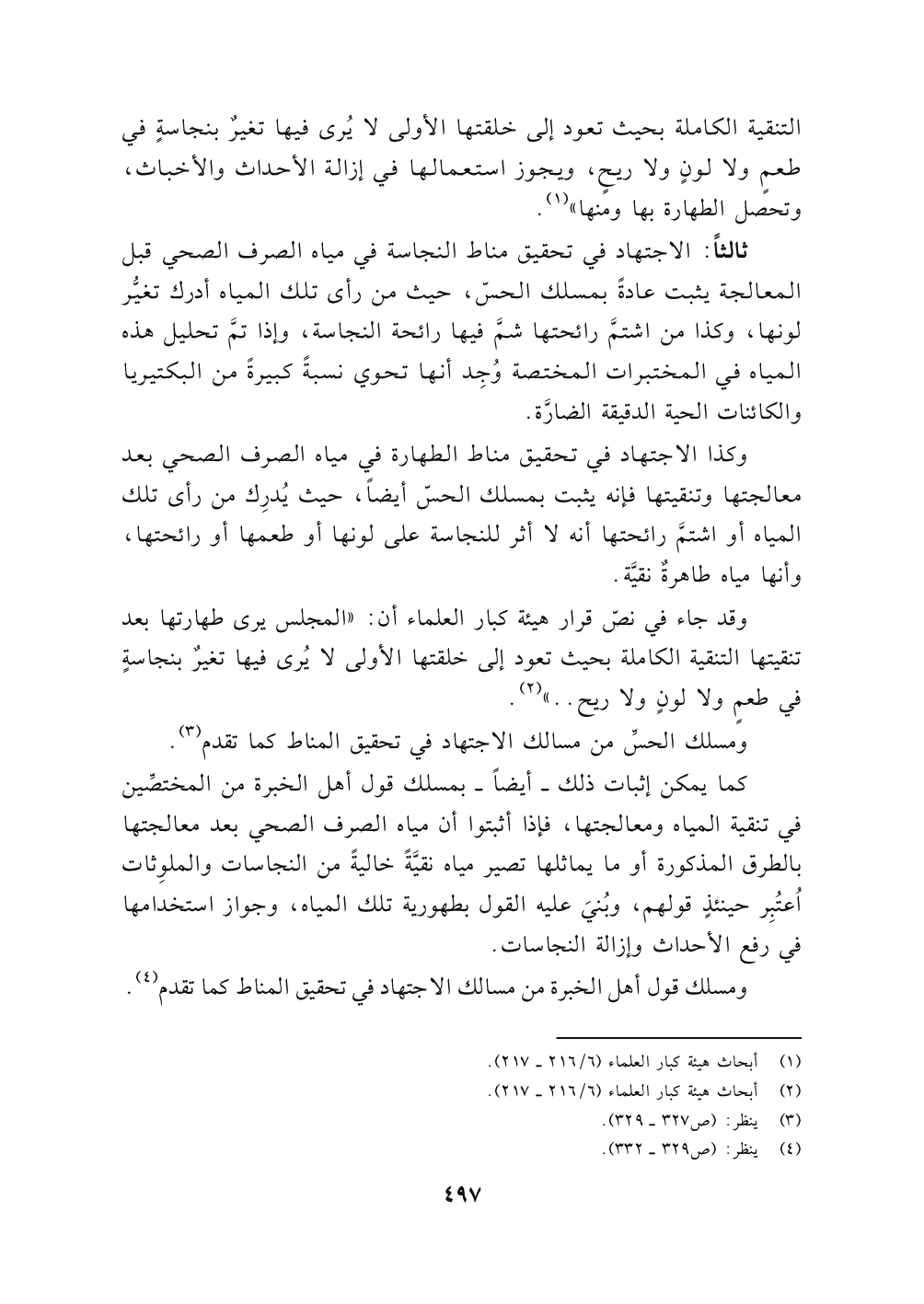 وقد جاء في نصّ قرار هيئة كبار العلماء أن: " المجلس يرى طهارتها بعد تنقيتها التنقية الكاملة بحيث تعود إلى خلقتها الأولى لا يُرى فيها تغيرٌ بنجاسةٍ في طعمٍ ولا لونٍ ولا ريح .. " (٢).