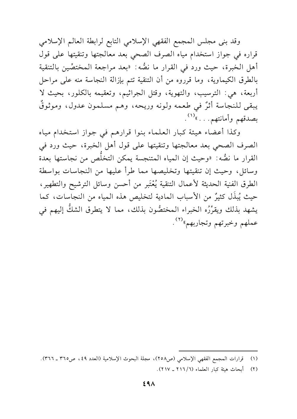 وكذا أعضاء هيئة كبار العلماء بنوا قرارهم في جواز استخدام مياه الصرف الصحي بعد معالجتها وتنقيتها على قول أهل الخبرة , حيث ورد في القرار مانصُّه: " وحيث إن المياه المتنجسة يمكن التخلُّص من نجاستها بعدة وسائل، وحيث إن تنقيتها وتخليصها مما طرأ عليها من النجاسات بواسطة الطرق الفنية الحديثة لأعمال التنقية يُعْتَبر من أحسن وسائل الترشيح والتطهير، حيث يُبذَل كثيرٌ من الأسباب المادية لتخليص هذه المياة من النجاسات، كما يشهد بذلك ويقرِّرُه الخبراء المختصُّون بذلك , مما لا يتطرق الشكُّ إليهم في عملهم وخبرتهم وتجاربهم" (٢).