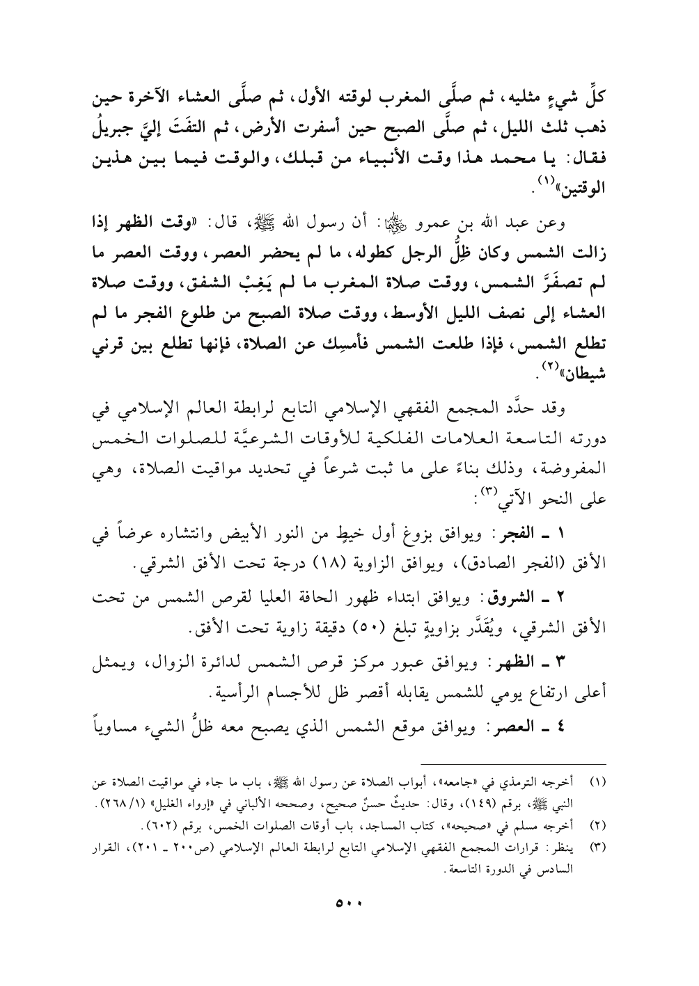 وعن عبد الله بن عمرو رضي الله عنهما أن رسول الله صلى الله عليه وسلم، قال: «وقت الظهر إذا زالت الشمس وكان ظِلُّ الرجل كطوله، ما لم يحضر العصر، ووقت العصر ما لم تصفَرَّ الشمس، ووقت صلاة المغرب ما لم يَغِبْ الشفق، ووقت صلاة العشاء إلى نصف الليل الأوسط، ووقت صلاة الصبح من طلوع الفجر ما لم تطلع الشمس، فإذا طلعت الشمس فأمسِك عن الصلاة، فإنها تطلع بين قرني شيطان» (٢).
